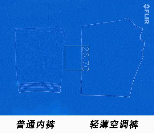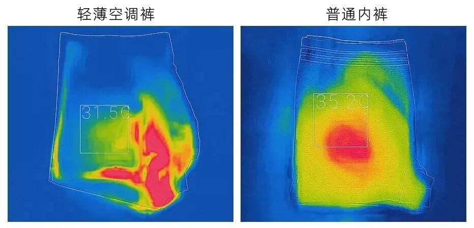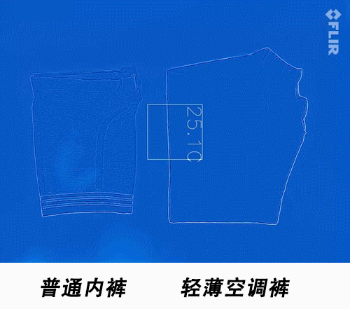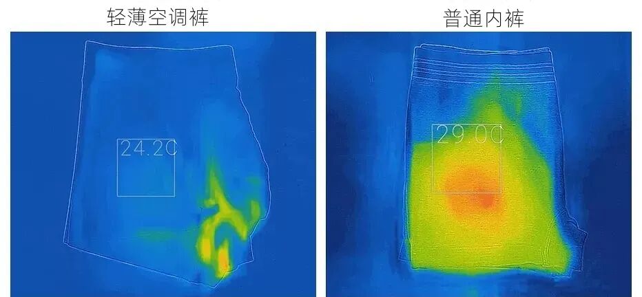 用吹风机分别给两条内裤的裆部吹热风10分钟后,分别记录在正常室温下10s,30s,1min三个时间段的散热对比:![]()