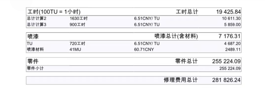 今天保险公司才做完车辆定损,发了个明细过来,修车费一共28万。