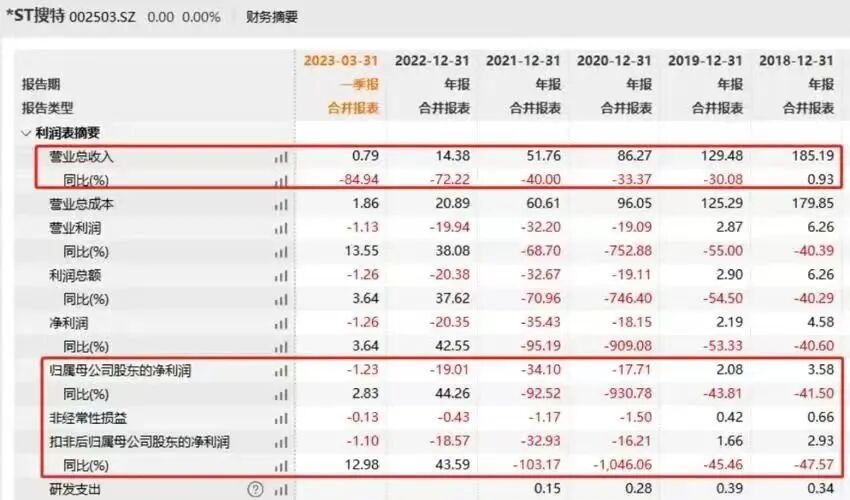 然而,随着韩流文化的逐渐没落,搜于特的业绩也出现了断崖式下跌,深陷巨额债务泥淖。2020年至2022年,搜于特营业收入分别为86.27亿元、51.76亿元、14.38亿元,分别同比下滑33.37%、39.9%、72.22%;净利分别亏损17.71亿元、34.10亿元、19亿元,三年累计亏损超70亿元。