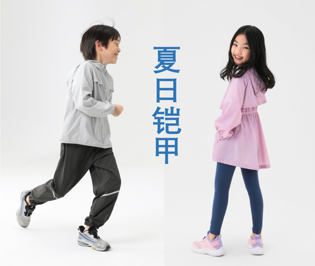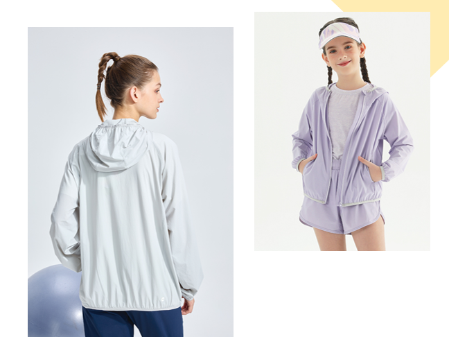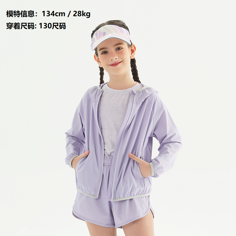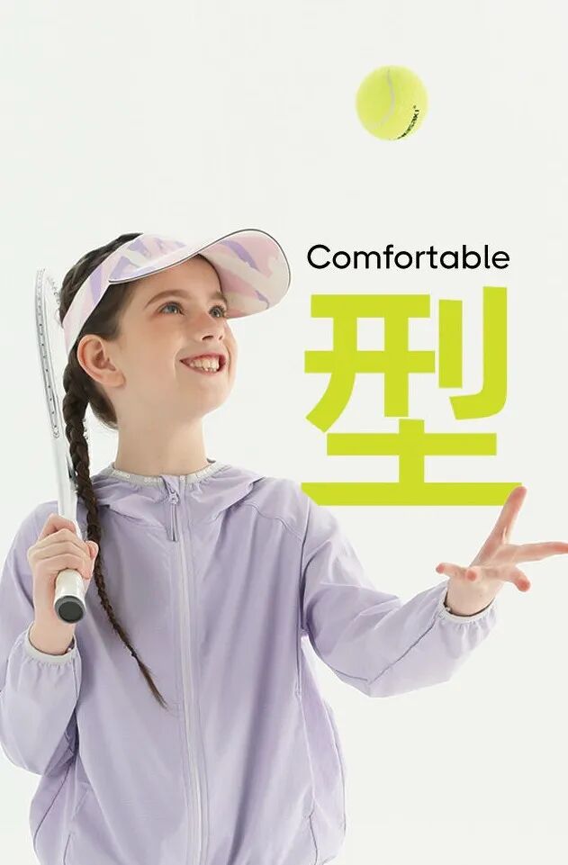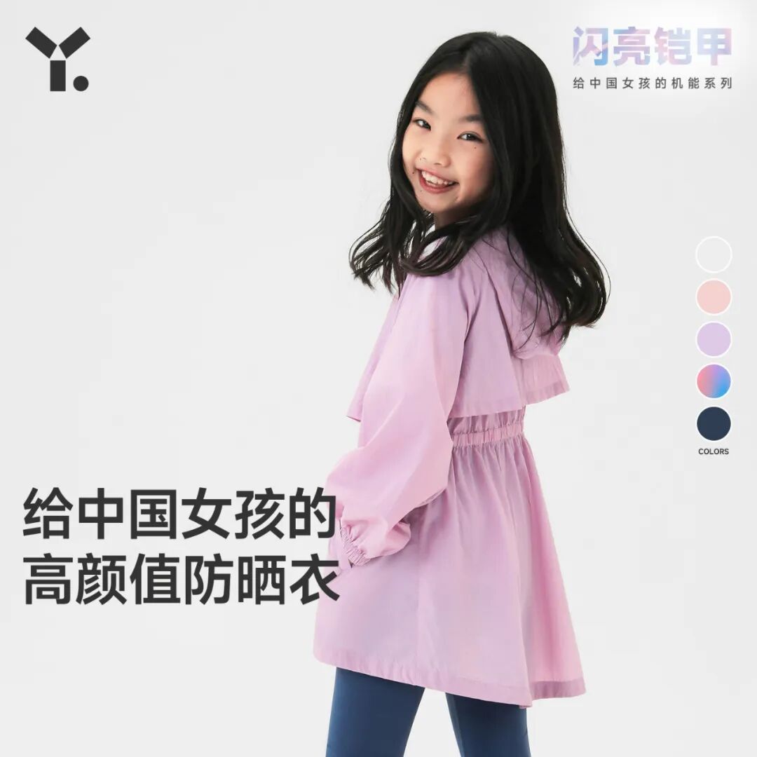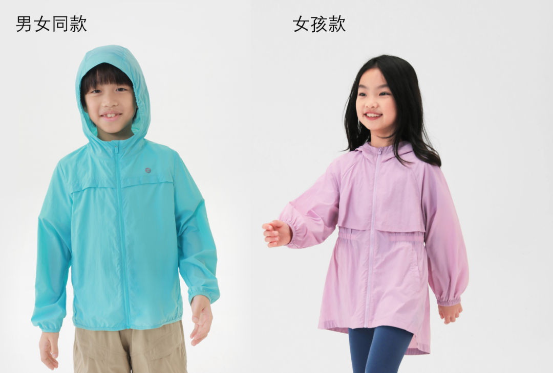 基础款属于男女同款,轻盈柔软的手感,腋下两侧和后背的透气设计增强排湿功能,让孩子不觉得闷热。女孩款的防晒衣官方为它定义为“闪亮铠甲”,设计为前短后长,让女孩穿着瑜伽裤或打底裤时,更加放心无负担。背后的透气孔设计以及收腰的款式,保证孩子们要美丽,又要凉爽的需求。