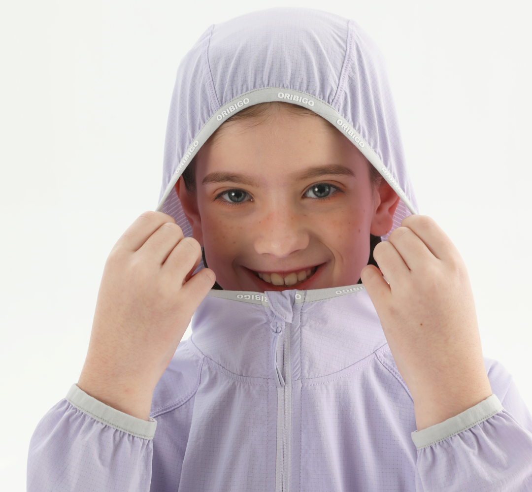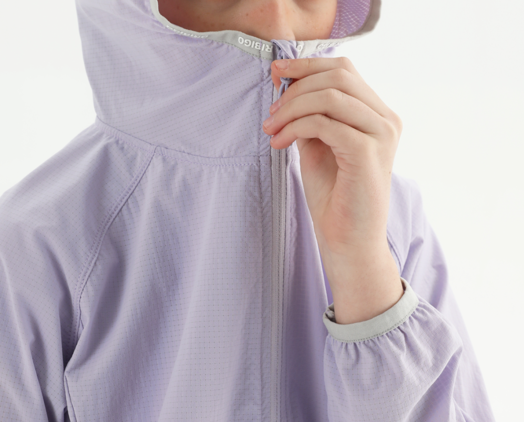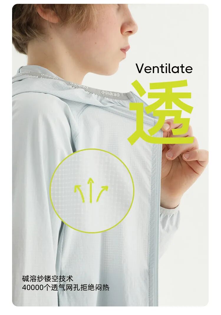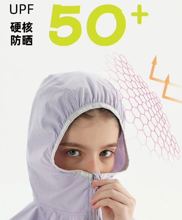 下面我们再具体介绍一下3个产品的各自特点,以及如何选择适合自己或孩子的型号。Oribigo的基础款亲子防晒衣,采用了独立研发的AeroMeshTM,面料的防晒纱线均匀分布,有效阻隔98%以上的紫外线。