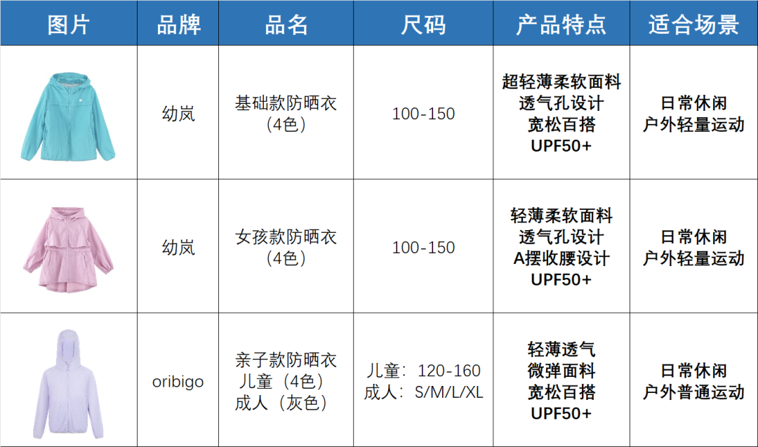 在测评中,我们关注的参数包括:面料成分,衣服自重,透气排湿、款式设计以及防紫外线性能检测等等。最终我们根据我们对防晒衣设定的目标:防晒性能UPF50+的基础,以及轻薄透气,宽松不贴身。从这几十件防晒衣中,选择了2个品牌的3款作为今天的开团产品,就是:![]()