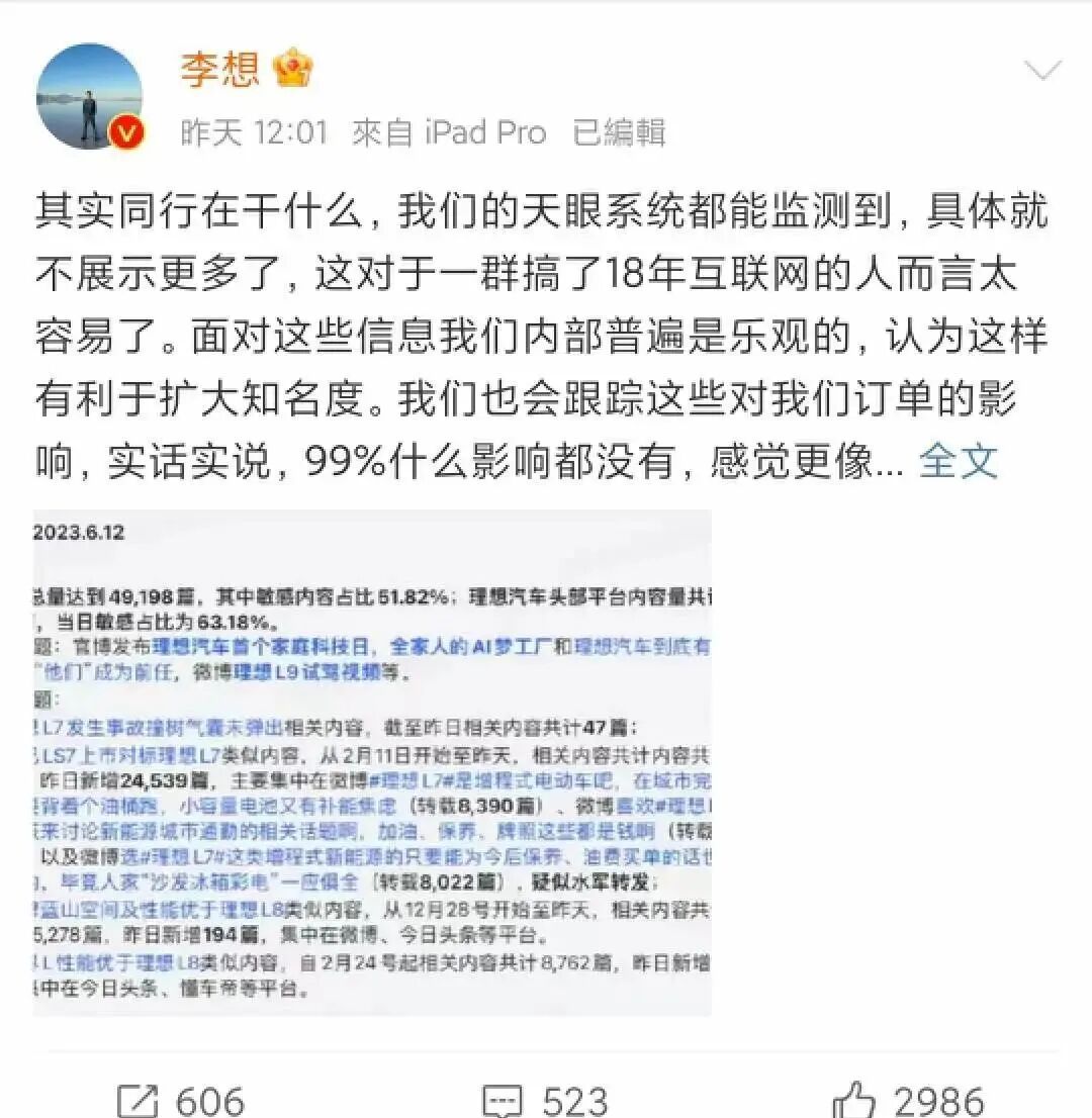 6月14日,理想汽车创始人李想发文称,“其实同行们在干什么,我们的天眼系统都能监测到。这对于一群搞了18年互联网的人而言太容易了。”文章配图中,晒出自智己LS7上市以来,全网对标理想L7的类似内容多达34000余条,其中仅6月13日一天,就增加多达24000余条,并用加黑字体强调“疑似水军转发”。