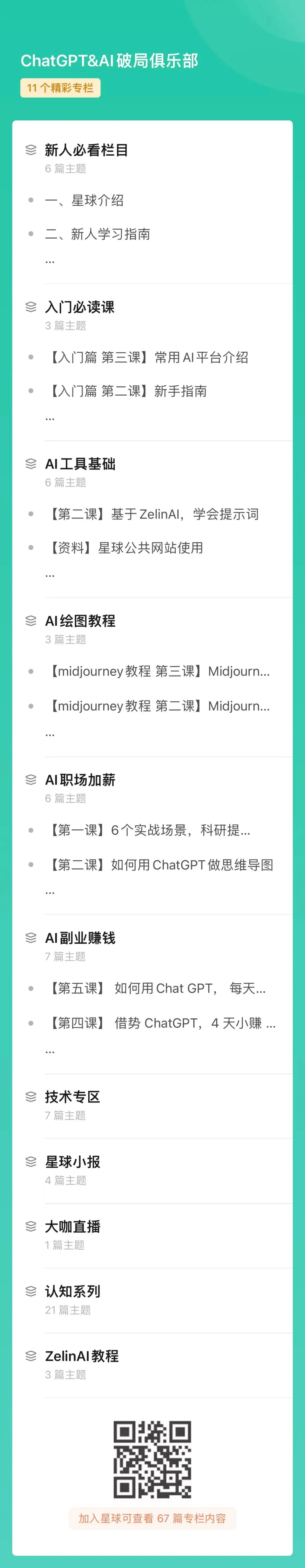 除此之外,我们还创建了一个私有的VIP群,群里会给大家分享各种福利,如专属AI产品:ZelinAI产品一年使用权(帮助小白快速做AI的工具)、chat.fkxz.cn网站(MJ绘图已上线)半年会员等等,当然创建这个群的主要目的还是为了和大家一起探讨、交流发现商机,然后做项目,最终目的当然是要赚到钱。(只有进星球的小伙伴才能进入这个群)