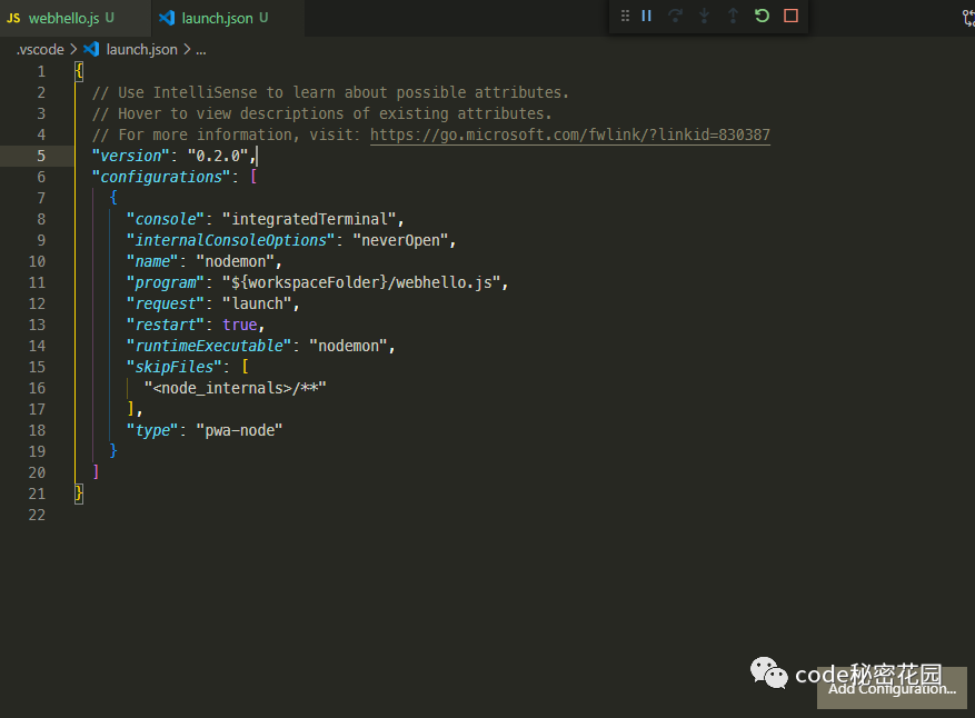 Node.js 进程本身,或者Web Socket 服务器,可能在远程机器或 Docker 容器上运行。上面的屏幕截图显示了 nodemon 启动配置。Add Configration 按钮提供了一个 nodemon 选项,因此你应该编辑该 "program" 属性来指向你的入口脚本 ( ${workspaceFolder}/index.js )。