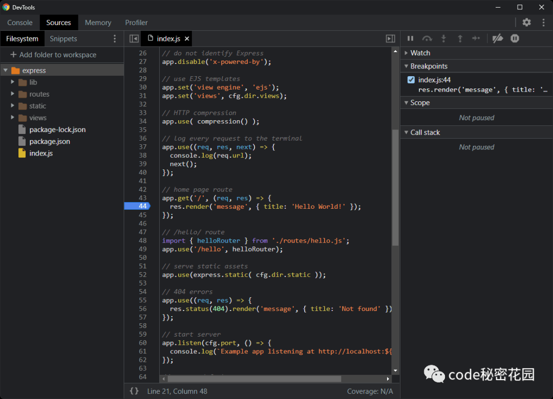 要直接从 DevTools 加载、编辑和保存文件,请打开 Sources 看板,单击 Add folder to workspace,选择 Node.js 文件的位置,然后单击 Agree。现在可以从左侧窗格或按 Ctrl| 打开你应用程序的任何脚本,Cmd+P 并输入文件名。单击任意行号来设置断点(显示为蓝色标记):