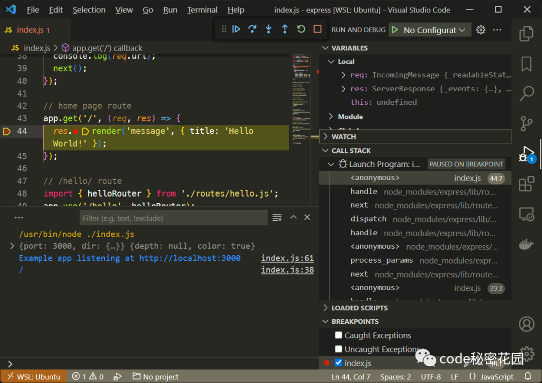 VS Code 支持 Node.js 并具有内置的调试客户端。在本地系统上运行 Node.js 应用程序时无需配置。打开你的启动脚本(通常是 index.js),激活 Run and Debug 看板,单击运行和调试 Node.js 按钮,然后选择 Node.js 环境,单击任意行来激活断点。