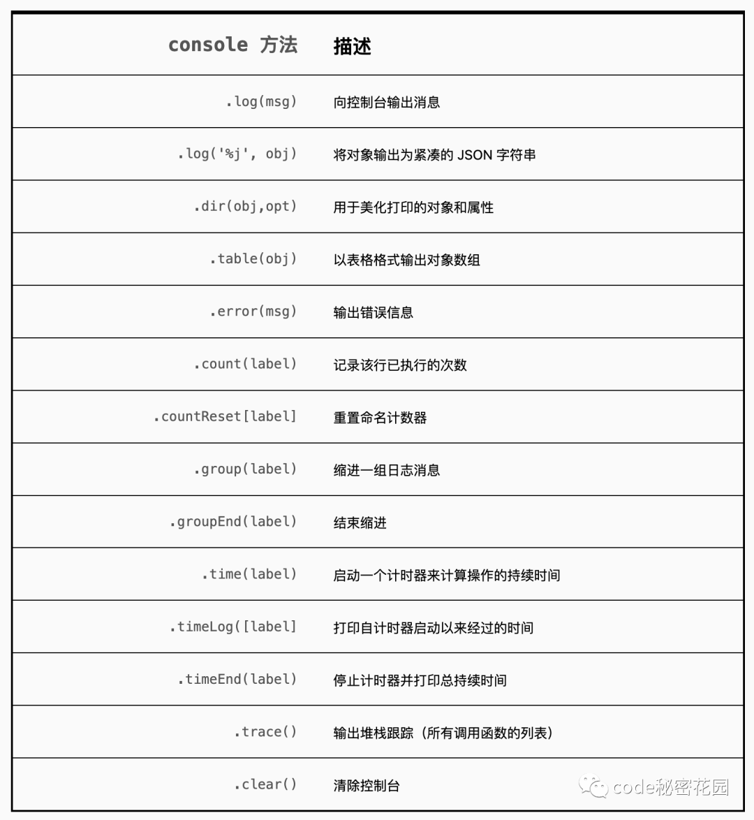 一些开发人员声称你永远不应该使用 console.log(), 因为这样会变更代码,并且存在更好的调试选项。但我还是认为控制台打印日志记录是一种更快速实用的选择,查找和修复错误比你使用的查找方法更重要。我们还应该考虑使用 console.log() 之外的其他方法: