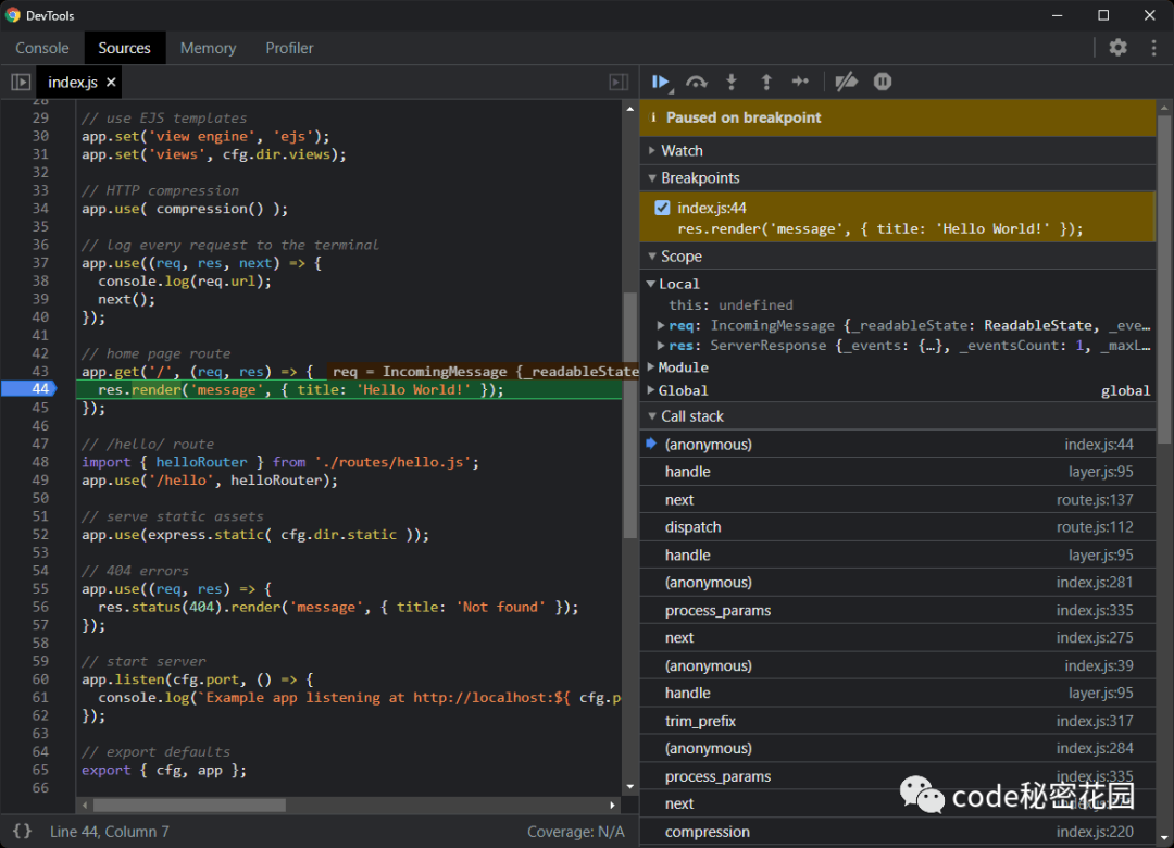 您可以使用 --inspect-brk 替代 --inspect 来停止第一个语句的处理,这样你就可以逐行执行。然后打开 Chrome 浏览器(或任何其他基于 Chromium 的浏览器)并在地址栏中输入 chrome://inspect :