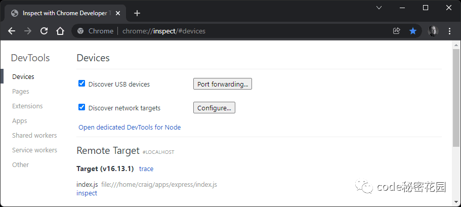 几秒钟后,你的 Node.js 应用程序应就会显示为远程目标。如果没有找到,请选中 Discover network targets 并单击 Configure 按钮来添加运行应用程序的设备的 IP 地址和端口。单击目标的检查链接来启动 DevTools,如果你使用之前使用过浏览器调试客户端应用程序,这应该很熟悉。
