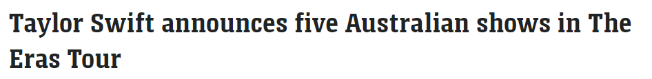 澳洲新闻集团6月21日报道称,经过几个月的猜测,泰勒·斯威夫特(Taylor Swift)宣布她将于2024年在澳洲举办时代巡回演唱会(The Eras Tour)。