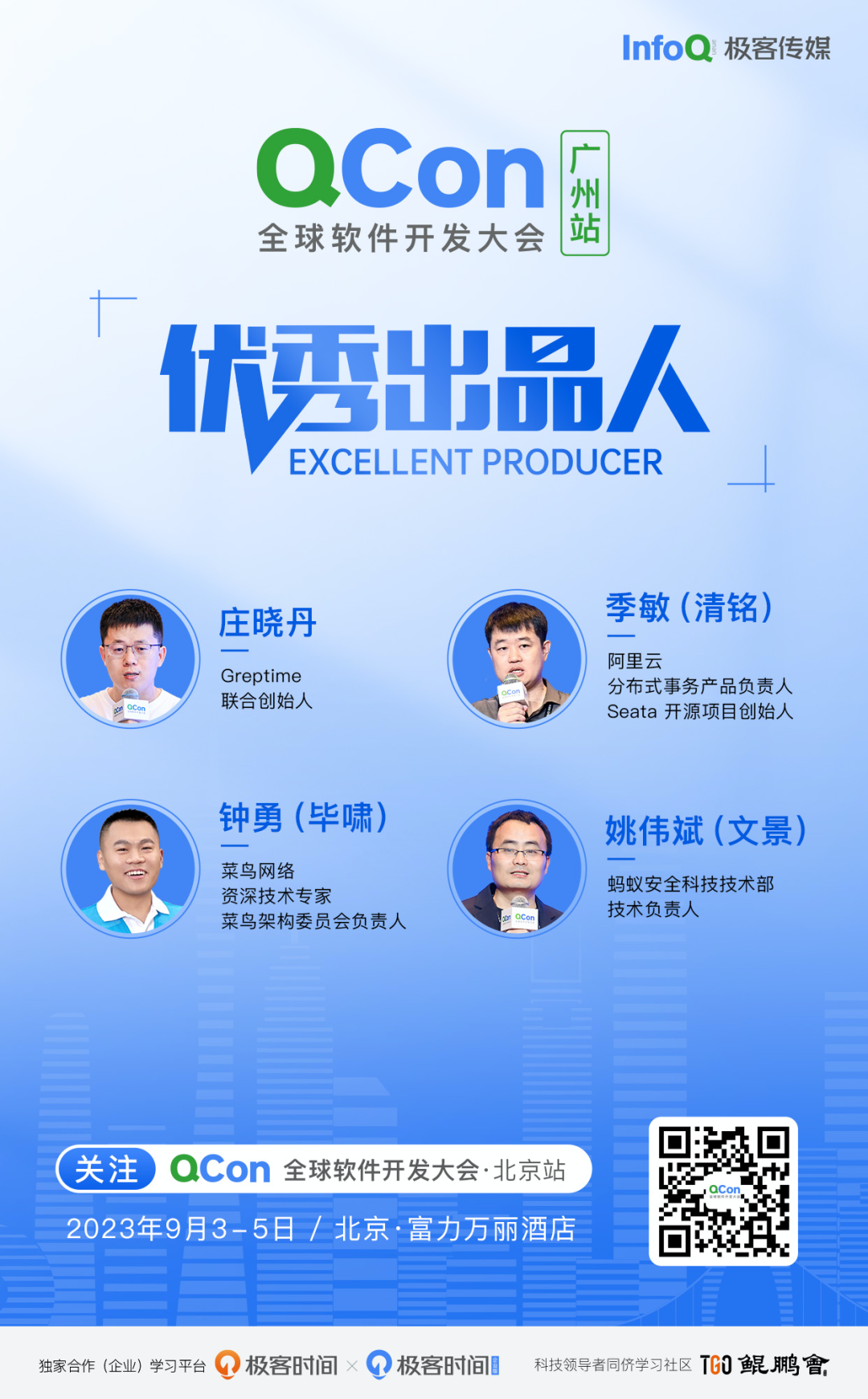 优秀出品人的评选由组委会统一进行,需满足如下条件:在大会筹备期间,和组委会一起给予讲师专业且中肯的建议,帮助讲师优化内容和演讲技巧,最终使得专题场均满意度 90% 以上。最终选出优秀出品人 4 位,名单如下:
