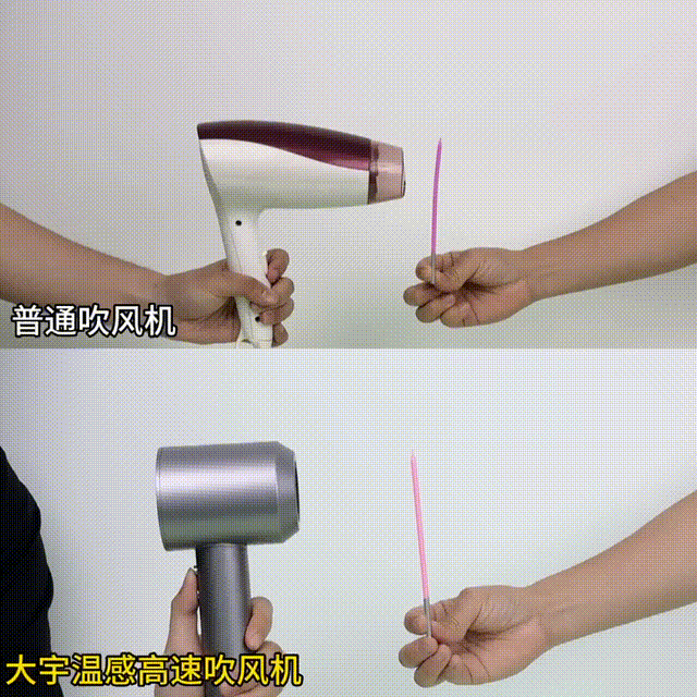 结果非常明显:普通速干吹风机风力很小,风力完全带不动乒乓球!而我们的大宇高速吹风机唰一下“吹飞”乒乓球!