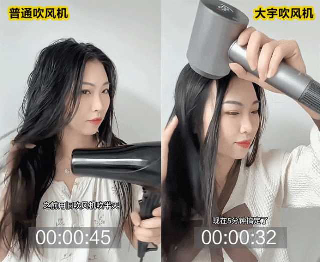 再来测下吹头发,普通速干吹风机需要10分钟,与家里30多块钱的吹风机没啥区别。而大宇吹风机吹干头发只要3分半的时间,可以说非常之快!