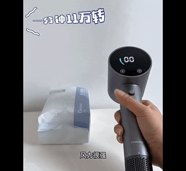 吹风机的干发能力其实主要由电机转速决定,转速越大,风力越大,干发速度也会更快。大宇吹风机内置了动力强劲的直流无刷电机,转速高达11万转,风力可达22m/s高风速为了检验大宇吹风机的速干能力,我们用普通速干吹风机进行风力对比。
