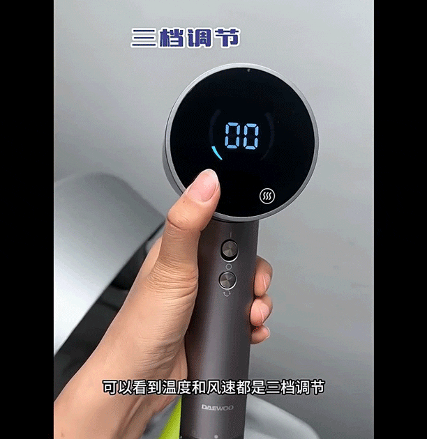 为了让大家准确的这些数值,这款高速吹风机设有高清可视化显屏设计,风温风速状态一目了然