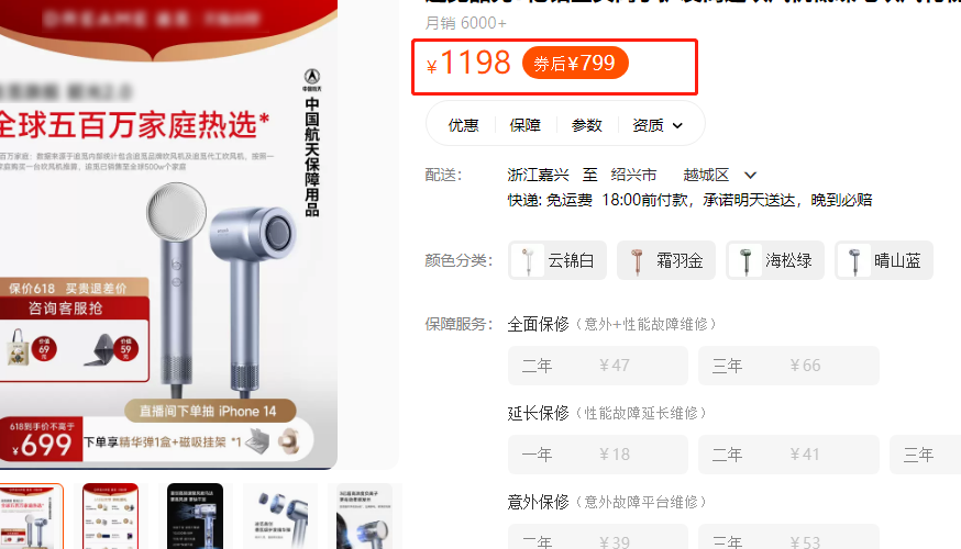 1、源自世界200强企业,品质超好,通过各项检测并拥有3C认证,保质期一年!2、直流无刷电机,11万转/分高转速+22m/s高风速,吹干头发只要3分钟。1000次/秒恒温监测,2亿高浓度负离子,保护发丝去静电,让头发更顺滑。3、四档温度,三档风力,一键冷热交替,高清可视化显屏设计,专为发质受损人群设定!源自世界200强企业
