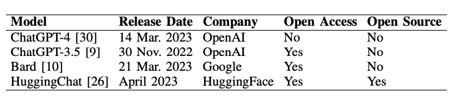 进而,研究人员基于 ChatGPT-4、ChatGPT-3.5、Bard、HuggingChat 四款大模型得到了输出内容: