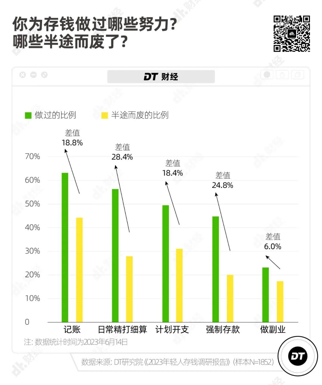 DT财经计算了几种常见存钱方式“做过”和“半途而废”的差值,相对好坚持的反而是排在第二、第四的日常精打细算和强制存款。