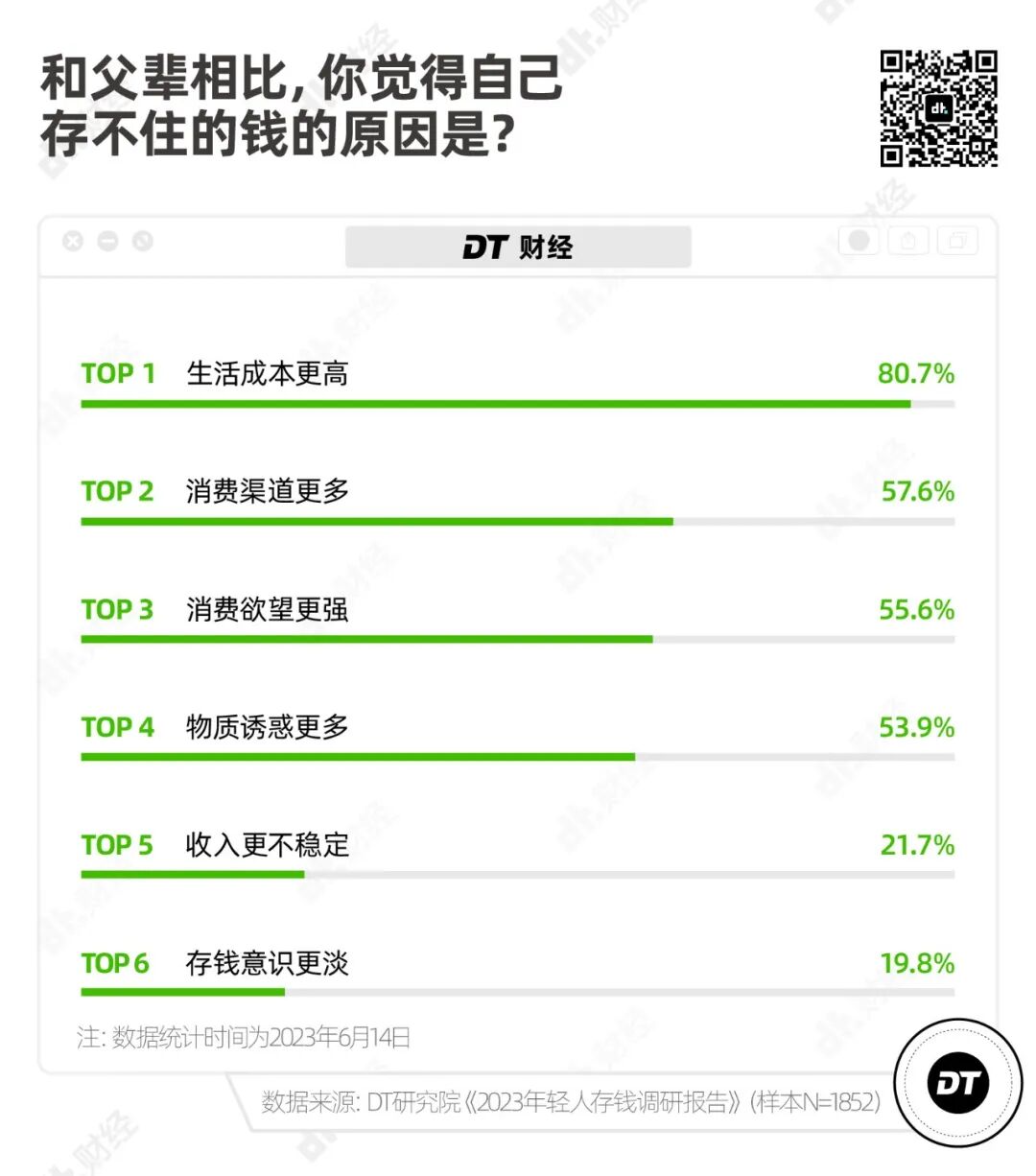 前段时间,“为什么父辈能存到钱”的话题上了热搜,DT财经针对这一问题进行了调研,结果显示,和父辈相比,年轻人存不下钱的原因还在于消费渠道更多和消费欲望更强。