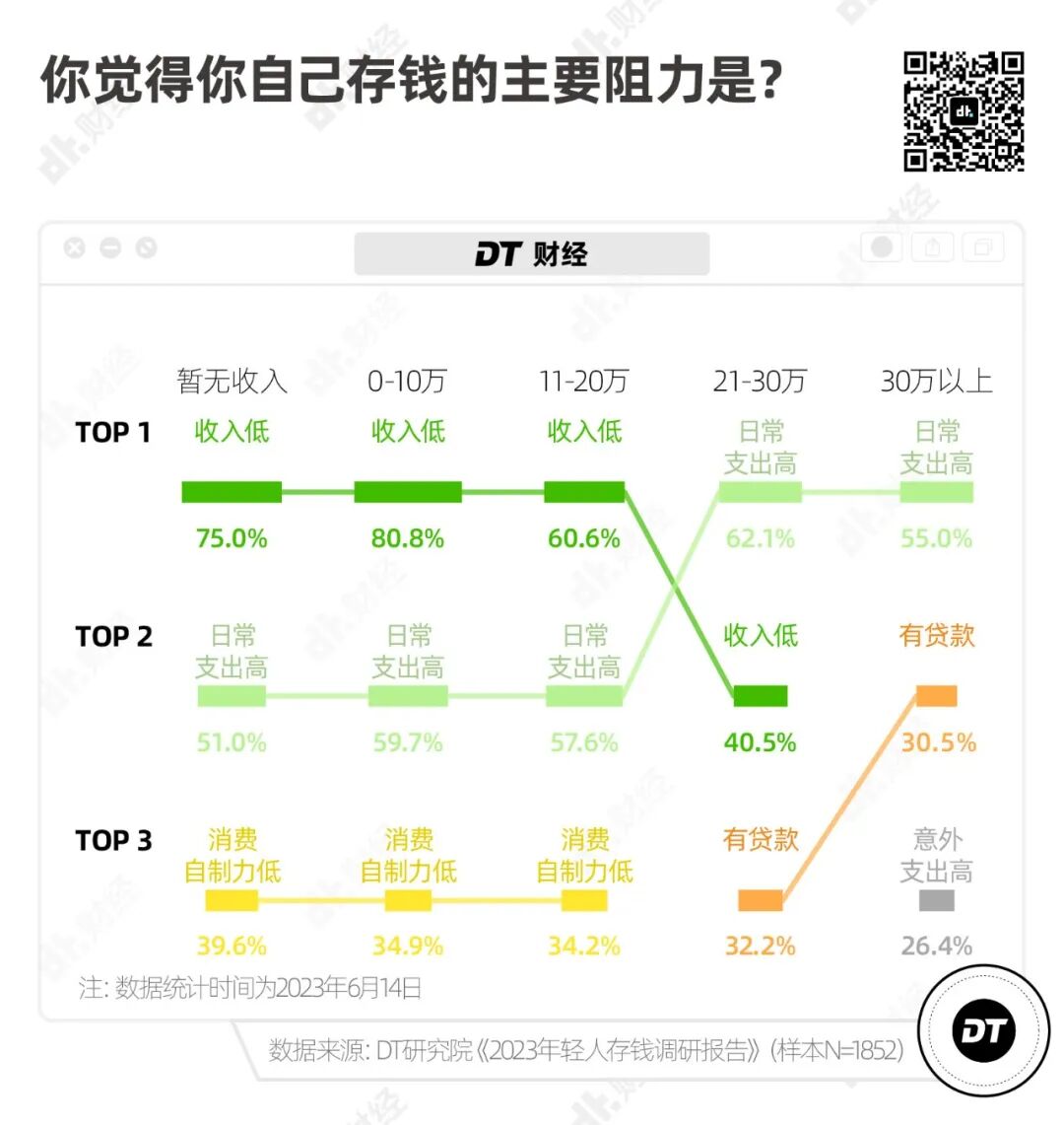 在收入较低时,大部分人认为自己存不下来钱的原因还有消费自制力差,而年收入超过20万的人群,存款阻力主要是贷款和意外支出。