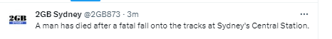 据2GB电台报道,事故涉及一名男子在火车站内坠轨身亡。