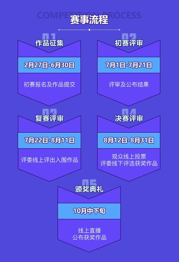 本次活动从2月27日至6月30日进行作品征集,作品经历初赛评审、复赛评审及决赛的观众投票与线下评选后,将于10月中下旬颁奖典礼,线上直播公布获奖作品。