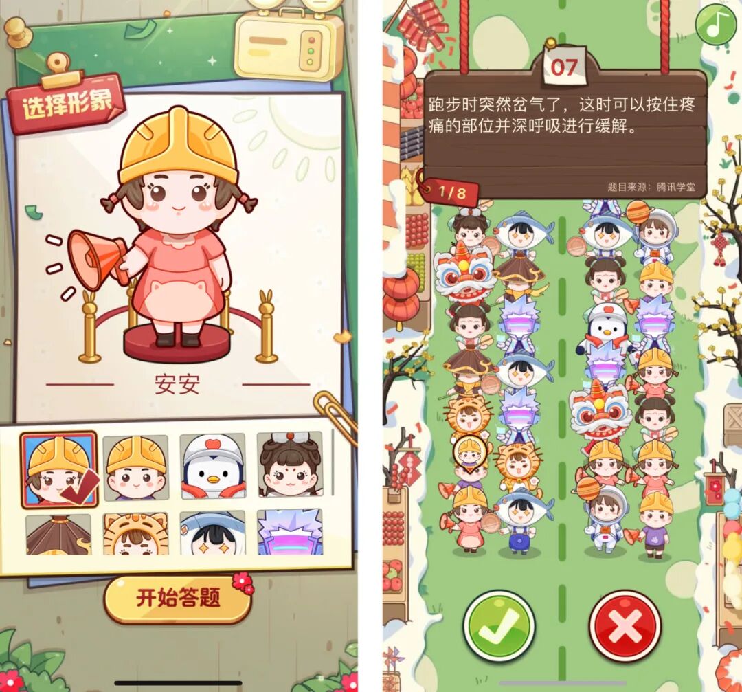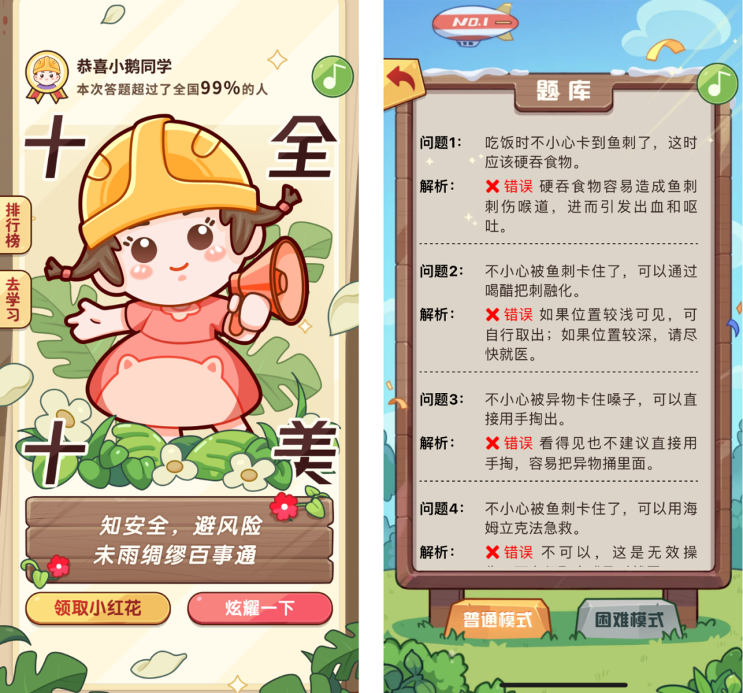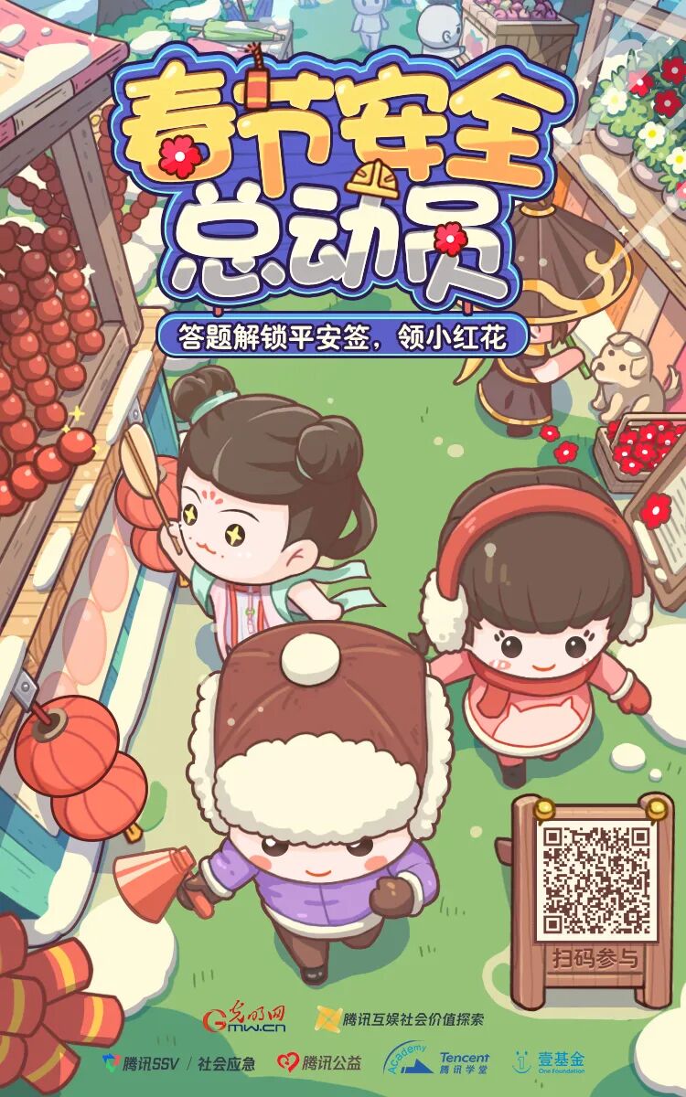 为提升大家的安全防范意识,小编为大家带来了“春节安全总动员——安全知识趣味答”互动体验H5,通过趣味答题互动帮助大家学习生活中常见的安全知识,还能解锁新春平安签,领取小红花,为公益梦想助力!扫描图中二维码进入活动页,自由选择角色参与安全知识问答,每轮随机生成8道题,选择正确的选项进行作答,全部答对还可解锁隐藏角色“狮狮如意”!通过完成答题闯关即可解锁对应角色的平安签海报,并获得机会领取1朵小红花(每日上限1朵),而小红花可被继续捐赠给公益项目或者公益梦想,鼓励大家持续做好事!知识储备不够怎么办?没关系!在“知识库”页面中,可以查看并学习所有安全知识题目的答案及解析,题目覆盖异物卡刺、户外伤害、突发急症、动物叮咬、运动损伤、中毒处理、道路交通、消防安全等不同主题和多元场景,帮助大家学习预防和应对实用安全知识。本次活动由腾讯互娱社会价值探索中心联合光明网,与腾讯SSV社会应急实验室、腾讯公益、腾讯学堂、壹基金共同推出,相信学习完这些安全知识后,遇到突发情况的你会更加沉着冷静。快来@你朋友圈最机智的小伙伴来答题,和全国的小伙伴们一起比拼一下吧!