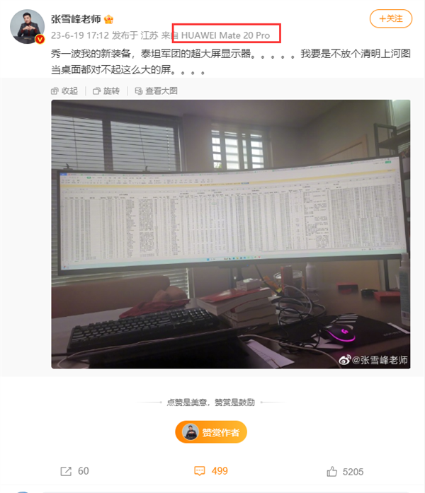 从微博尾巴来看,张雪峰现在用的手机还是华为Mate 20 Pro,是5年前(2018年)发布的手机。