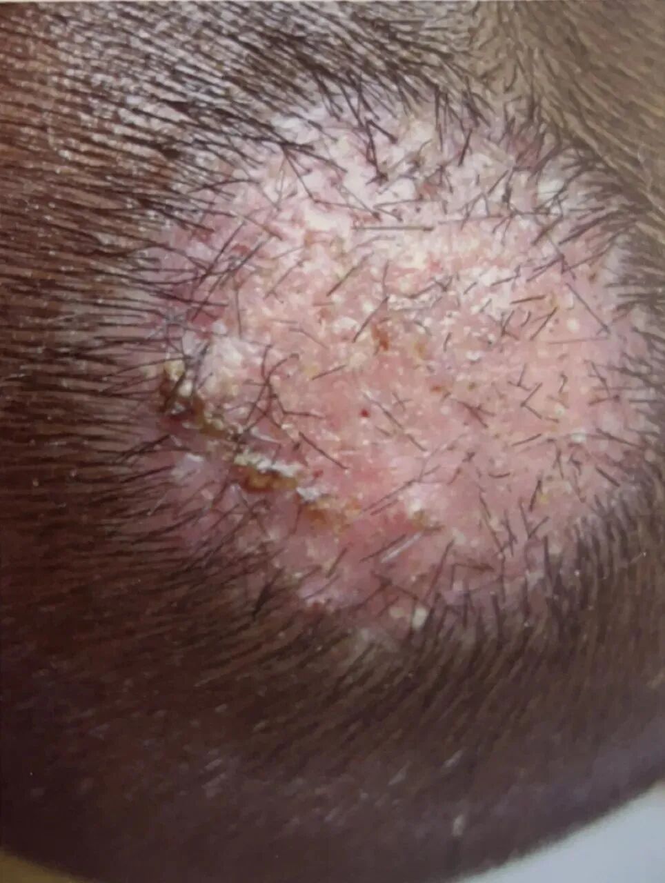 再比如头癣,头皮上的斑秃、毛发异样、脓疮、白屑,会影响美观,患者总不能一直戴着帽子见人。