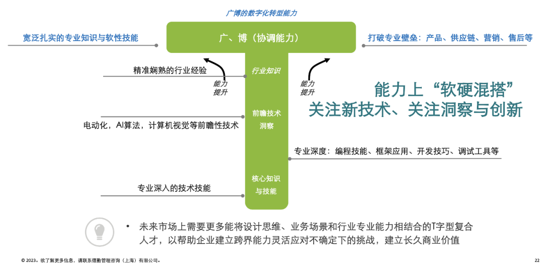 企业正在失去传统的边界,这意味着过去大家熟悉的管理秩序也将会逐渐消失,企业需要经过探索、试点和创新去定义管理的新法则。德勤中国管理咨询合伙人秦芹女士在日前举办的 DTDS 全球数字人才发展线上峰会上强调,面对众多挑战,人才建设将成为企业数字化转型最为核心的要素;而面对数字化转型带来的人才需求,企业不得不重新思考“人才从何而来、人才能力重塑”的问题。秦芹重点围绕“组织”和“人”两个维度介绍了企业如何在“无边界世界”实现良性发展:一方面,企业必须构建能力型组织。随着“岗位”的边界消失,技能将替代岗位,成为员工和工作的连接点。对于企业而言,需要健全人才能力标签体系,从而更好的选人、识人、用人,最大化发挥员工价值。另一方面,企业也需要不断提升数字化人才能力,通过搭建数字化人才画像,实现能力和技术的共同提升。以下是演讲实录(经 InfoQ 进行不改变原意的编辑整理):在过去的 12 年中,德勤全球人力资源研究团队发布了一系列《全球人力资本趋势调研报告》,今年我们报告的主题叫“无边界世界的新法则”。今天我会主要介绍一下我们在报告中的一些核心发现,以及在接下来数字化的工作当中,有哪些因素会影响人力资源的高级从业工作者。第一,岗位的边界。岗位不再按照职能和职责划分,而是以技能为基础进行灵活迭代。比如说一个人才发展经理现在可能还要兼职某一个事业部 BP,或者牵引企业内部数字化人才能力重塑得项目,并且还要在与数字化部门沟通协作的过程中扮演类似于产品经理的角色。他的岗位边界正在随着企业和社会的变化不断拓宽。第二,组织的边界。从明确且独立运营的组织,转变为合作共生的生态组织。第三,劳动力的边界。全职及单一归属的员工转变为兼职零工等多元的生态员工。比如打车平台司机、外卖骑手等等。第四,工作场所的边界。从固定、现实的物理空间,转变为非固定、混合现实的多元空间。如今大家已经适应了线上线下融合的工作方式,甚至在元宇宙当中工作。第五,现代公司的边界。当一个公司在社会当中发展越来越大,它肯定要为社会做出更多的贡献,而当它遇到挑战和危机的时候,也会有更多人帮助它。在这些变化之下,德勤今年的研究报告当中展现出三大趋势、九大法则。第一个趋势是要求所有 CHRO 或者 HRD 能够要像研究者一样思考,因为在数字化时代,必须不断地尝试、试错,向着一定的目标去探索。这个趋势下包含三大法则:一是“岗位”的概念走向“终结”;二是科技赋能人才;三是激活未来工作场所。第二个趋势是共创新型关系,即组织和劳动力生态之间的关系。这个趋势下也包含三大法则:管理员工数据,在构建数据资源的同时又保护隐私;发挥员工的主动性,发挥人才的能力;解锁劳动力生态,把更大的生态为我们所用,实现灵活用工。第三个趋势是优先考虑对人的影响。这个趋势下同样包含三大法则:一是大胆行动,争取公平结果。也就是要以人为中心,要考虑人的多样性,才能更好地激发产出,优化员工的体验;二是推进可持续发展中人的因素,在双碳战略中,让每个企业、每个人都作出贡献;三是提升对人的风险关注,因为很多风险事件的发生,最关键的影响因素还是人本身。接下来我们重点围绕“组织”和“人”两个维度介绍企业如何在“无边界世界”实现良性发展。随着岗位边界消失,技能将成为员工和工作的连接点。过去传统大企业很像一个运行紧密的机器,每一环都是环环相扣的。而现在的社会更多像一个球队,每个人之间、工作之间既各司其职又相互关联。企业要应对这种变化就必须构建技能型的组织。当然,并不是所有的岗位都不需要了。其中 80-90% 的岗位都还存在,只是边界在拓宽;而另外 10-20% 需要用技能来补偿,让人的因素发挥到最大化。具体来看,岗位边界正在发生以下五个方面的变化:第一,灵活的,而非预先确定的;第二,非常规的;第三,专注于创造价值;第四,视情况而定的,而非标准化的;第五,越来越以工作小组为导向。接下来看两个看似相悖,实际上有强关联的概念,即拓宽工作和分解工作。比如,有的企业在做新零售的过程中,需要将线下门店和线上的能力去做融合,这背后必然会带来工作流程的变化,员工职能职责的变化,甚至是薪酬和岗位评估的变化,需要企业去做一些拉通的动作才能保证在岗位拓宽过程中一些机制不失效。而分解工作指的是为了增强敏捷性,把“工作”分解为有价值意义的更小单位,比如分成一个个项目和任务,这样一来尽管商业需求在不断变化,拥有相关技能组合的员工也能被分配到对应的 “工作”中。当然,企业在组织变革、流程再造、岗位重塑等各个层面的改革很多时候没有办法完全依靠人力资源驱动,它需要成熟的时机。但是,我们仍然可以用一个要素来补足组织和岗位的不完美,它就是充分发挥“人”这个要素,尤其人的“技能”。这里的“技能”更类似于人才标签的概念,比如包括编程、数据分析和会计等方面的硬技能,包括情商和批判性思维在内的思维特质,包括有可能被开发并引领未来成功的潜能等等。对企业来说,非常重要的是如何更大化地把这个人和他的岗位进行匹配,发挥他最大化的价值。更具体一点,在技能标签之外还有更大的标签体系,叫做人力资源标签体系。比如,下面