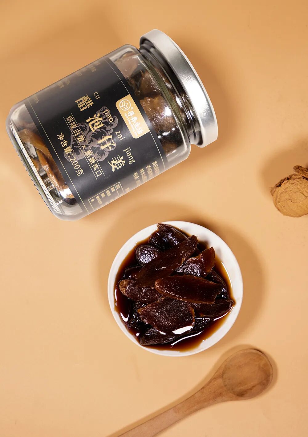 陈醋色泽黑紫,绵、酸、甜、醇厚,回味悠长,在腌制过程中能够更好的综合姜的辣味。