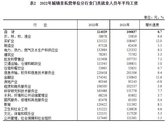 数据显示,2022年,全国城镇非私营单位就业人员年平均工资为114029元,比上年增长6.7%,增速比2021年回落3.0个百分点,扣除价格因素实际增长4.6%。
