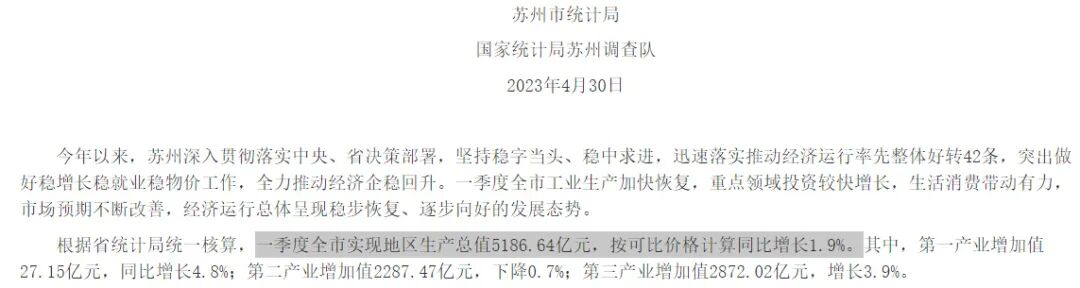 有别于江苏城市群整体向上,苏州在2023年一季度GDP为5186.64亿元,同比增长1.9%。从20强排名来看,成都在2023年一季度GDP以5266.82亿元赶超苏州,成都排名第6位,苏州排名下滑至第7位。探究可见,苏州在2023年第一季度,第二产业增加值2287.47亿元,同比下降0.7%。其中,苏州规模以上工业增加值同比下降2.7%。苏州是中国工业和出口的双料第三大城市,产业结构高度外贸化,且外企占比较高。公开数据显示,在苏州的进出口结构中,外商及港澳台企业的进出口总额占比62%。