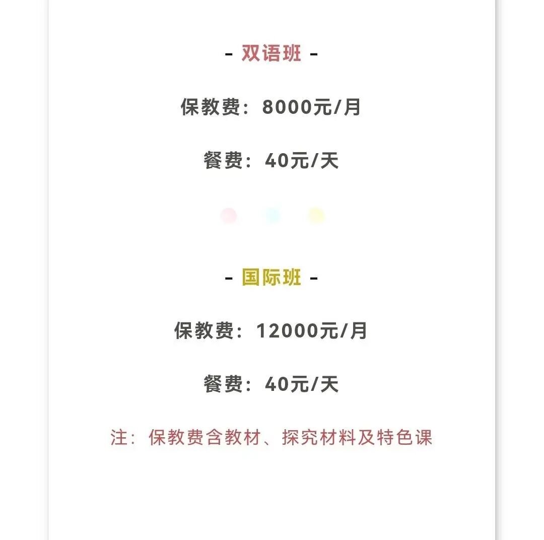 该幼儿园官方微信公众号显示,幼儿园于2018年3月首次招生,每生每学期学费8000元(后期在不同阶段按7折或8折优惠),每月保育费5600元。2021年的招生信息显示,该园双语班每月保教费(包含教材、探究材料和特色课)8000元,每天餐费40元;国际班每月保教费12000元,每天餐费40元。