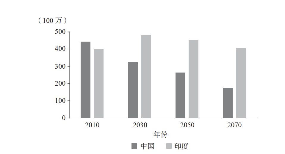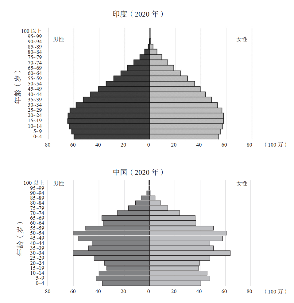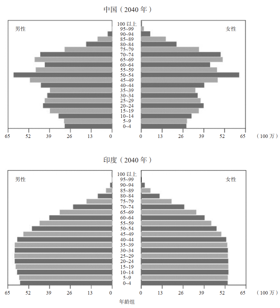 这些移民美国的印度裔精英人群可以在许多方面襄助母国。许多跨国公司正在扩大在印度的投资经营,在印度建立研发中心,部分原因正是因为作为高管的印度裔能够参与公司未来战略决策。彭博社预测,未来 15 年,印度经济将保持每年 7% 左右的增速,经济总量翻两番, 2030 年人均收入将达到 8 000 美元的规模。届时印度将超过日本和德国,成为世界第三大经济体。2030 年之后,与中国不同,印度虽然仍会相对贫穷,但得益于更庞大、更年轻的群体以及越来越多的人口红利,印度可以继续发挥后发优势,实现比美国和中国更快的增长。从现在起的两代人时间里,印度的劳动力人口将比中国庞大得多,而青年劳动力的数量将达到中国的两倍。预计到 21 世纪末,印度经济将反超中国和美国,成为世界最大的经济体。印度拥有创新型国家所必备的要素:稳定的政府、开放和自由的市场、高素质的教育、不断增长的出口业,最重要的是正增长和年轻化的人口。目前,中国也拥有正增长和年轻化的人口这一要素。然而,中国人口很快就会增长缓慢并且步入老龄化。有鉴于此,印度经济将有很大的机会在未来赶超中国。如下图所示,中国存在显而易见的人口问题,而印度如今的人口结构呈现出近乎完美的金字塔形,印度的中位年龄是 28 岁,而中国的中位年龄是38 岁。印度的生育率在 2.4 左右,而中国的生育率为 1.4,印度的生育水平高出中国几乎一倍。2022 年印度新生儿的数量约为 2 400 万人,而中国只有 956万人。这就意味着,中国每年新生儿的数量比印度少 60%当印度在 2040 年达到中等收入国家水平时,印度将拥有世界上最大的人口数量,具有最大的规模优势(见下图)。而英语作为官方语言也是印度的优势,英语更好的印度人才更容易进入世界市场,印度企业更容易在世界各地经营,印度学术界会更轻松地与世界其他地区交流。此外,常用英语的优势使得印度能够吸引更多的移民。到 2040 年,印度的经济增长将快于中国,可进一步缩小印度与中国的人均 GDP 差距。与此同时,印度的生育率将继续显著高于中国。因此,印度的人口预计将达 16 亿之巨,比中国人口高出约 30%( 12 亿)。印度的劳动年龄人口约为 8 亿,而中国为 5 亿,几乎高出中国 60%。因此,即使印度的劳动生产率只能达到中国的 2/3,印度的经济规模也终将大于中国,且远远高于美国。我们来看一下对中国和印度的青年劳动力人口的预测,到 2070 年,印度年龄在 20~39 岁的青年劳动力将超过 4 亿,是中国的两倍多(下图)。我认为,青年劳动力是劳动力人群中最有创造力和最具创业精神的群体。不仅印度会有更多的年轻劳动力,而且相比中国,印度的年轻人会成为更好的创新者和企业家,因为如《人口战略》一书中所探讨的那样,中国将面临老龄化社会的阻挡效应。到 21 世纪末,印度的创新性极有可能超过中国。总之,作为新兴国家里人口规模最大的国家,印度具有很强的创新潜力。中国也许能在 10 年后超越美国成为最大经济体。与此同时,印度的经济规模将快速增长,逐步赶上中国。人口形势的变化将成为美国、中国和印度三个主要经济体相对竞争力演变的主要驱动力。