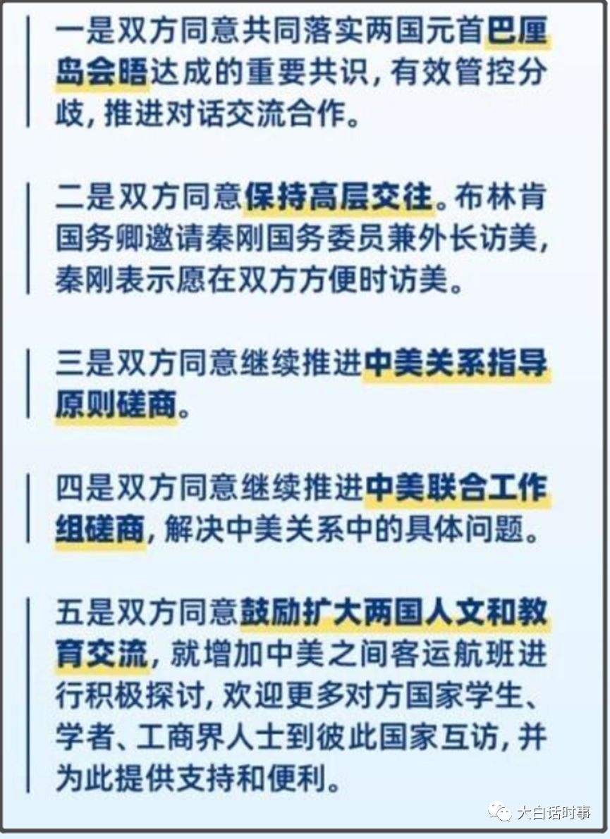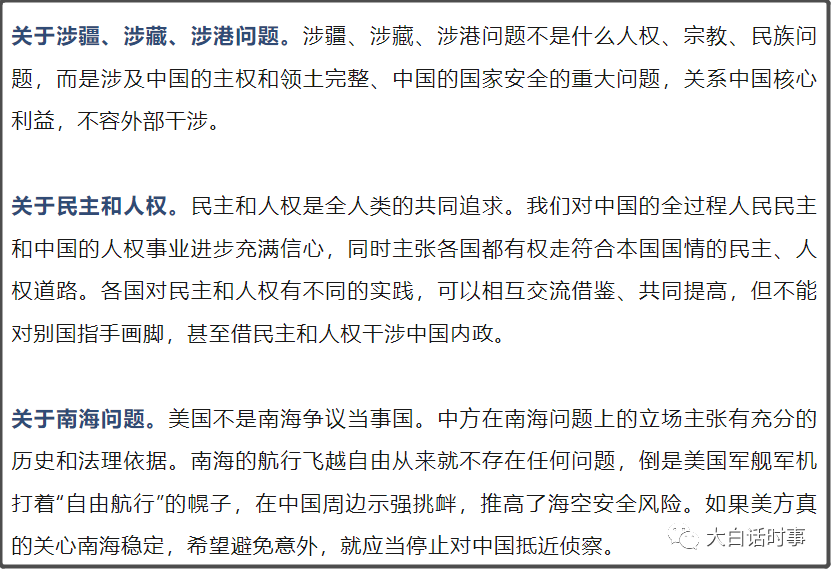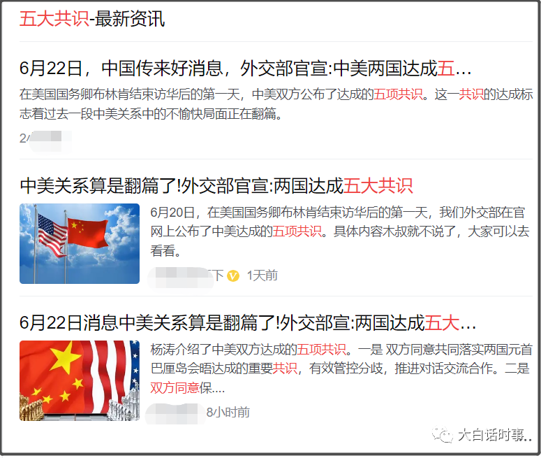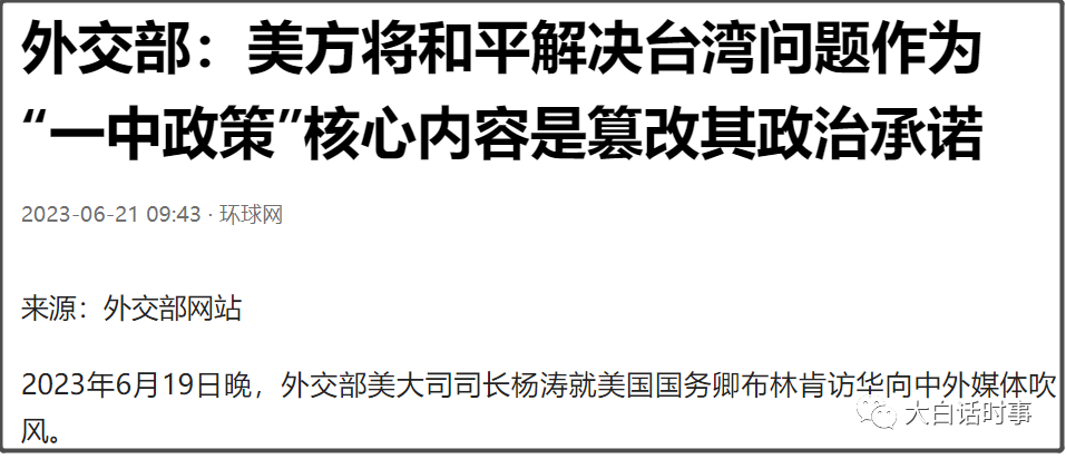 但在这样的通稿平淡描述的背后,却是我们普通人难以想象到的惊险。6月18日,在布林肯抵达北京的那一天,远在数千里之外的南海,却是波涛汹涌,惊险万分,具体发生了什么,我们不得而知。但我知道一句话,“战场上得不到的东西,在谈判桌上也得不到”我这时候有点明白,为何总感觉布林肯这次来北京,总是黑着一张脸。我们一直是爱好和平,但这不代表我们面对美国霸凌,就只能忍气吞声!我们爱好和平,但如果美国胆敢进犯,我们也是会坚决击退强敌。理清楚这些,我们对于拜登前天又开始大放厥词来对我们挑衅,就不会感到奇怪了。布林肯访华,虽然让已经冻结三个月之久的双方沟通渠道,得到了恢复解冻。但这仅仅只是我们和美国之间重新有了谈的契机,并不代表双方就握手言和,中美之间的博弈斗争,并不会因为布林肯访华而休战。布林肯6月20日离开北京,仅过了一天,拜登就在一次筹款活动上,面对他的支持者和金主,开始对我们大放厥词,重新拿本来已经翻篇的气球事件说事,而且还说了一些极其不友善的话。这说明,拜登并没有任何诚意想跟我们搞好关系,对我们仍然充斥着严重的敌对思维。这也说明,布林肯这次访华,并没有达到美国想要的结果。并且,美国航母还被我们给“破防了”,这可能也让拜登也“破防了”,才会让拜登在6月21日这样没有一丁点外交礼仪,有些认知混乱的胡言乱语。美国一贯的霸道逻辑是,“凡是可以不讲理的地方就一定不讲理。”这句话另外一层就是,美国可以动粗碾压你的时候,绝不会跟你多说两句话。当美国开始跟你打嘴炮的时候,说明美国已经没有底气“以武服人”。6月20日,布林肯在离开前的记者会上,说了不少东西,仍然还是扯着美国过去一直以来对我们污蔑,还有我们反对的那些陈词滥调,显示美国也并没有太大变化。特别是美国对于这次布林肯访华的几次通稿差异,可以看出布林肯的一些小心思。比如,跟秦外长和王主任见面,美国的通稿都是只有几句话,篇幅很短,描述也都很模糊,显得美国态度有所软化。但是,6月20日记者会的通稿,还有布林肯离开北京后对这次行程的总结通稿,篇幅就很长,大致主要就是说,布林肯提了什么什么,就是一些我们觉得不好听的话,言下之意就是布林肯没有让步。不过,我觉得布林肯搞这样的小心思,越说明美国心虚。要美国不心虚,大可以在前两次通稿,别把篇幅弄得那么短,不要搞模糊描述。现在人离开北京了,就大肆宣扬他啥都提了,这也太心虚了。所以,我们昨天也开始指责“美方篡改其政治承诺”,这个主要针对布林肯离开前关于“一中政策”的扭曲。我之前分析过,美国说坚持“一中政策”,和我们所说的“一中政策”,是不太一样。布林肯在离开前的记者会上,提到了我们不承认的法案。这个我觉得应该是跟布林肯在跟我们见面时候说的话,是有出入的。所以,我们才会指责“美方篡改其政治承诺”。外交部美大司司长表示,“美国的“一中政策”本来是干干净净的,只用了中美三个联合公报作定语,但后来定语越来越多,先后加上了“与台湾关系法”、“对台六项保证”。不论是“与台湾关系法”,还是“对台六项保证”,都是美方单方面炮制出来的,不是中美双方共识,中方从一开始就坚决反对、不予承认。美方现在还有一个动向,将和平解决台湾问题同“一中政策”相关联,作为“一中政策”的核心内容。这不是对美方对华政治承诺的重申和坚持,而是篡改。”这都充分说明,美国所谓加了一堆定语的坚持“一中政策”,是在掏空“一中政策”。我们之所以要明确这样反驳,就是因为布林肯离开北京后,发布的详细通稿里,充斥着大量这样扭曲和掏空“一中政策”的内容。这也充分说明,美国政客这种“人前一套、人后一套”,“说一套、做一套”的虚伪本质。昨天,外交部美大司司长还做了十答中美问题,主要就是针对布林肯访华后,美方公布通稿里,大量扭曲篡改的内容,我们进行了逐一反驳。而关于中美两军关系,我们也明确说,“对于当前中美两军关系面临困难的原因,美方非常清楚,包括对中方的单边制裁,两军交流合作首先要移除障碍。”我们态度很明确,想要恢复两军沟通,美国得先取消制裁,否则免谈。从我们这些反驳,还有会谈后这两天各方动向看,本次会谈,我们并没有任何妥协和让步,美国也没有获得他们想要的任何结果。反倒是美国航母被我们破防的事情,让美国显然也有些心理破防,拜登才会显得有些歇斯底里。我们这次虽然见了布林肯,但并不是所谓“超预期”,也不代表中美关系要缓和了。这更多,可能只是因为,美国被破防后,我们才见一下美国。包括拜登前天的胡言乱语,也说明本次会谈结果并不太好。我们最近公布的布林肯本次访华达成的“五大共识”里,前4个都是恢复沟通渠道,只有最后一个是扩大两国人文和教育交流。这其实已经说明,布林肯本次访华的主要成果,就是维持沟通渠道,仅此而已。这个基本是在我之前分析的预期之内,其实并没有达成什么实质性结果。不过我注意到,网络上一搜这个“五大共识”,马上就出来一堆这种“中美关系翻篇了”的文章。我们总是说“抛弃幻想”,结果这次布林肯访华,还是让我见识到,我们网络上仍然有大量的人,还是对美国抱有幻想。每次只要双方一接触,总有这种鼓吹双方立马和好的言论。结果仅过了一天,这种幻想