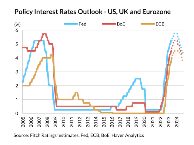 在欧美,美国就业市场持续紧张,超额储蓄提供缓冲,加之供应瓶颈解除均令美国经济具有弹性,惠誉预测美国今年经济增速为1.2%。不过该机构认为货币紧缩正在起效,预期美联储将在7月和9月分别加息25个基点,需求将随时间推移而承压,就业增长也将在今年晚些时候转为负值。该机构表示,越来越多证据表明需求疲弱正在扩大,近几个月以来,商业投资有所恶化,制造业产出停滞不前,申请失业金人数逐渐上升。库尔顿提及美国银行业流动性压力,称虽然没有导致信贷紧缩立即出现,但融资成本正在上升,信贷紧缩对经济增长的打击可能超过预期,尽管如此,美国仍然坚持加息。“美联储加息将令美国经济陷入轻度衰退,但发生的时间点已被推迟到今年四季度至明年一季度之间。”惠誉预计,2024年美国经济增速将进一步放缓至0.5%。尽管欧美整体通胀有所下降,但受累于服务业通胀上行,核心通胀仍旧顽固。美国劳工部于13日发布最新数据,5月消费者物价指数(CPI)同比上涨4%,较去年6月时的峰值9%大幅回落,但5月核心CPI同比涨幅仍有5.3%,是美联储2%通胀目标的两倍有余。欧盟统计局近期数据显示,欧元区5月CPI同比上涨6.1%,为一年多以来的最小涨幅,当月核心CPI同比上扬5.3%,同样远高于欧央行设定的目标值2%。库尔顿表示:“发达国家央行日益担忧通胀持续性,促使我们大幅调高利率预测,目前预计美联储和欧央行均会在未来几个月内进一步加息两次,分别达到5.75%和4.5%的利率峰值, 且2024年之前不会开启降息。”![]()