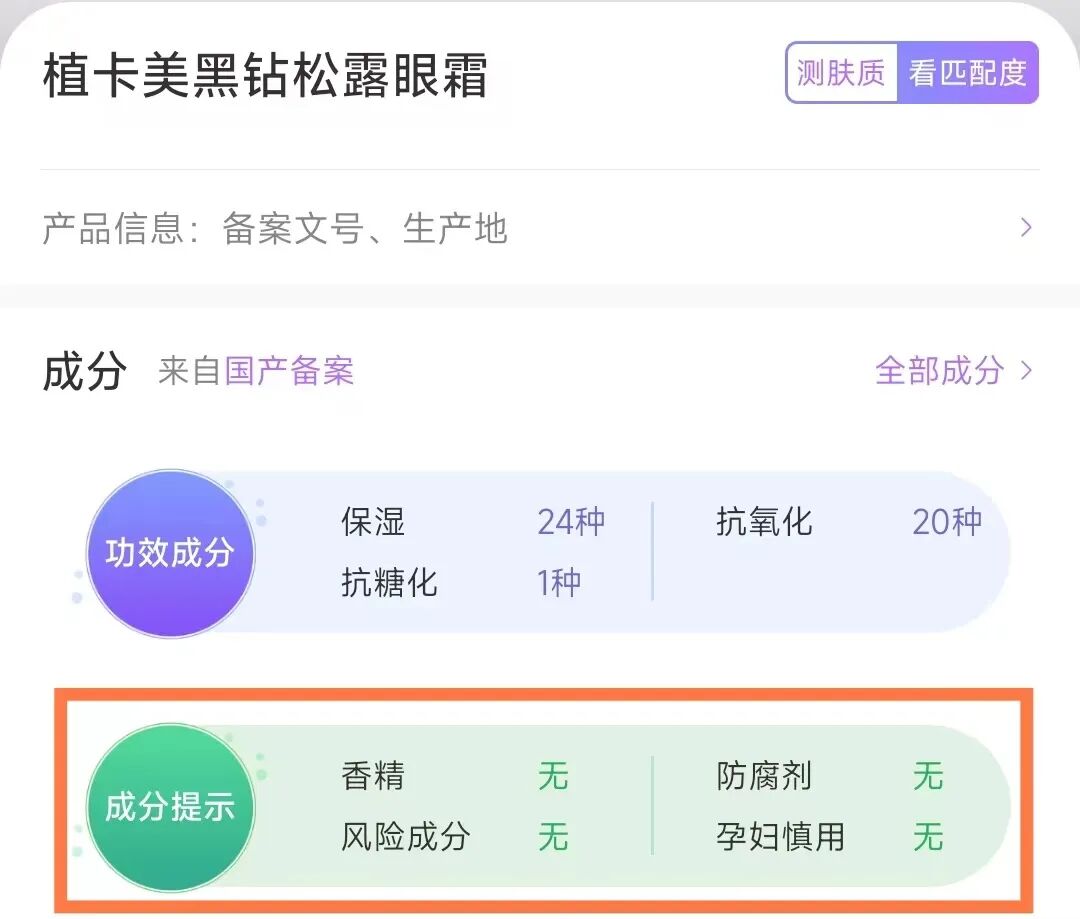 当然有!这也是我今天要给你推荐的,一款贵妇级抗老的黑钻松露眼霜。它是我们的老朋友植卡美,新推出的黑钻松露眼霜,核心成分是意大利进口黑钻松露,添加量非常丰富。(这是她家高端线的抗老产品)植卡美研发团队,为了提高黑钻松露的吸收率,历时三年,才从几百种配方中找到了黑钻松露的完美搭档:黑酵母。你可以这样理解它们的关系,黑酵母就像碎石机,把黑钻松露这个“大石头”里面的营养成分,打散打细成容易钻进皮肤的小分子成分。这种黑吃黑的配方,很好提高了皮肤对于黑钻松露精萃的利用。你可能会质疑,真这么有效吗?别急,植卡美和原料商做了大量实验,你看看就知道它的效果有多强悍。为了验证黑钻松露即时紧致、抗皱的效果,他们请了志愿者,涂抹2小时后,你可以看到眼角和额头的皱纹明显淡了很多!这个用来救急非常好用。如果你周末要和朋友约吃饭,化妆的时候,可以先涂上一层这个眼霜,能防止卡粉脱妆,还可以将某些小细纹“紧急隐身”。然后当你到了后,她们会围着问你:“你昨天是不是去做医美了,前几天看你眼角明明有细纹,怎么现在好像都不见了......”用眼霜,你肯定看重的是长远效果,因此,他们还做了近1个月的测试,皱纹长度和深度都有明显的改变!所以你最好要有心理准备。一个月后,当你带娃下楼去游乐场玩的时候,碰上儿子同学他妈,她会惊讶你怎么变化这么大,然后一个劲拉着你,羡慕地问你怎么办到的......抗皱像买保险,一份不够稳当,两份勉强放下心头大石,三份才能安心睡个好觉。于是,这款眼霜还壕气地添加了两种抗老界翘楚:芋螺毒素肽和乙酰化玻尿酸。三重保险下,如果你坚持涂这款眼霜,你就会惊喜地发现,你的状态不输那些经常做医美的朋友!连国家认证的专业检测机构,都给出了证书:抗皱、紧致、舒缓功效显著。所以,如果你发现眼角出现了皱纹,松弛,你又不想做医美,只想用简单有效的方式来保养自己,那么,植卡美黑钻松露眼霜会是你不错的选择。而且你放心,还帮你在美丽修行上查了,它是不含香精、无防腐剂、无风险成分的,皮肤敏感的朋友可以放心用!你不必犹豫,因为,在眼睛上花点小钱,真的可以让你快人一步,远超你的闺蜜,同学,同事,身边的同龄人......把她们从现在开始就远远抛在身后,要不了多久,她们就会惊讶的发现:“你怎么越来越年轻了?”拿到手的那一刻,你可能会和很多人一样,第一感觉就像是几千块的贵妇品牌出的新品,精致奢华,质感拉满。捏开瓶盖,淡黄色慕斯状的眼霜映入眼帘,用手一呲溜就抹开了,“是一滑到底的那种,抹开就渗进去了,不油腻也不闷。”闻起来,有股淡淡的黑松露清香,吸收时凉凉的,就好像你走在刚下过雨的森林里,风裹挟着水汽拂过你的眼角。还有一个很让我们惊喜的是,这款眼霜很贴心地配置了一个鎏金微导棒。你可以在晚上洗漱后,用它蘸取黄豆大小的眼霜,轻盈地在眼周打圈,对着镜子看眼角慢慢变得水润、饱满......当然,你还可以厚厚地涂一层眼霜,放一首喜欢的音乐,边放空边用它按摩,让自己放松下来,去享受这片刻的美好。然后,第二天早上起来,你可能会惊喜地发现眼角紧致水润,摸起来弹QQ的,像是回到了20出头的好状态。也许你可能不需要繁琐的护肤步骤、不需要用美容仪、不需要进美容院,只需要将你现在用的眼霜换成黑钻松露眼霜即可。你可能不知道,这款眼霜上市时,首批产品基本上全部被植卡美VIP老粉内购完了。她们一用就爱上了这个贵妇眼霜,很满意它的效果、肤感,你可以看看植卡美提供的反馈图就知道: