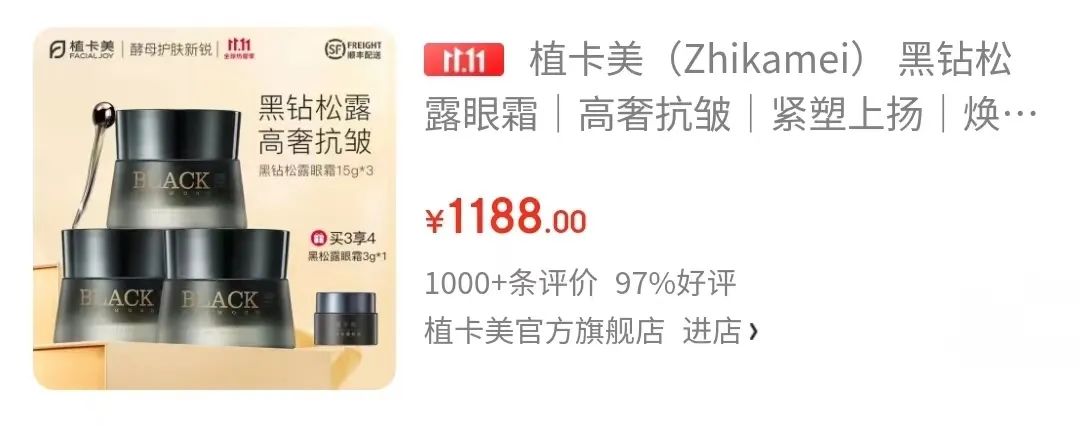 做过医美的朋友都知道,到正规医院,注射肉毒素大概一针在3k到5k左右,想稳定,还需要多次注射。而添加有黑钻松露、芋螺毒素肽这些成分的大牌产品,大多都是1000起步,更有甚者直接卖到了4000+。按理,这款眼霜,应该像这些稀缺的高端产品一样,定价至少也要上千。但植卡美为了回馈老客户,让大家可以无负担享受到贵妇级体验,前几批眼霜的售价,基本上是贴着成本价卖的。而且,由于原材料的稀缺,这款黑松露眼霜前几批只有几千瓶,并且品牌VIP老粉已经内购掉了80%。凭借着跟植卡美合作多年的关系,也只能给咱们粉丝提供200份,每个ID只能限购3份。超值福利价来了