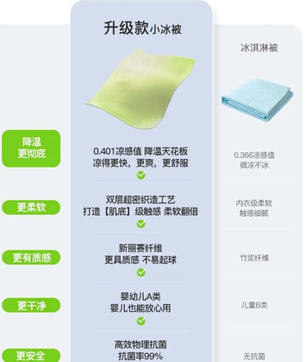 今年这款小冰被从凉感值,柔软度和透气性上都做了提升,面料也升级到A类的标准~