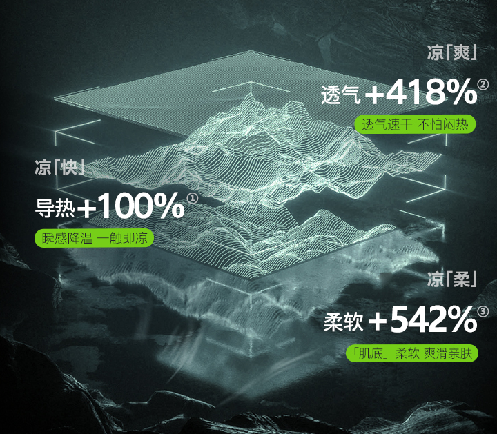 导热+100%,透气+418%、柔软+541%三者协同成就三维科技凉感~