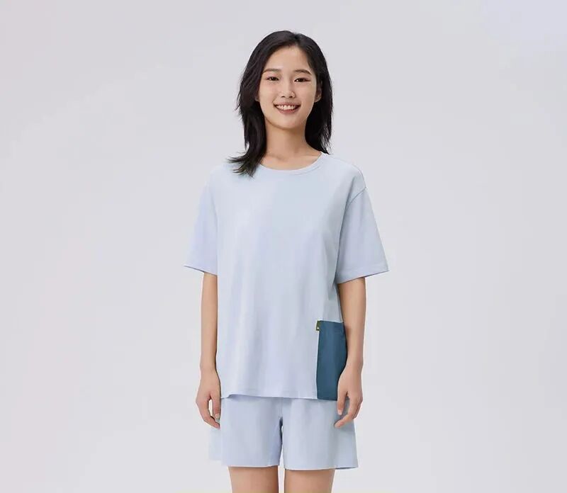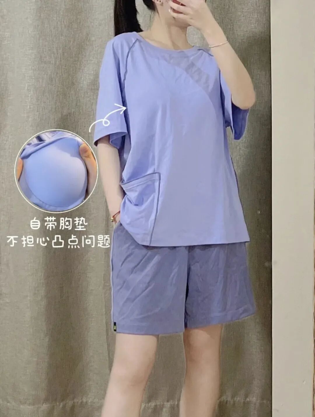 NO.4👉圆领大口袋家居服 圆领款式是经典简单之选,套头式上衣,轻松穿脱,自由随性。 水滴胸垫,修饰胸型,防凸点,不用再额外穿内衣,出门穿也不尴尬。 在纯色基础上搭配撞色大口袋,灵动活泼还很实用。 裤子、衣服口袋容量都超大,plus手机、钥匙、门禁卡更能轻松兜住,临时出门不用额外背包了,超方便。 有两个颜色,三个尺码,有点蓝、就酱紫,活泼减龄。 特惠价到手139元