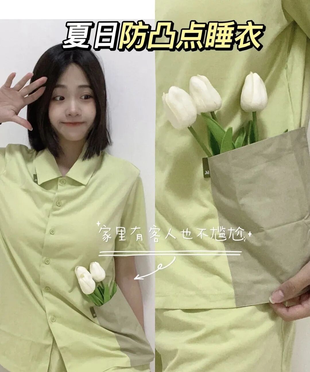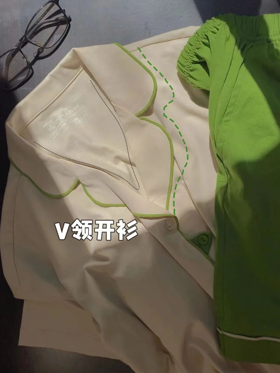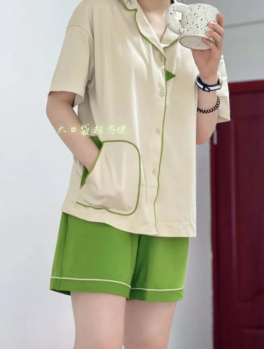 半练家居服的颜值更是戳动人心,宽松设计,舒服又显瘦;配色巨好看,配色清新,外穿也很时尚。 颜值杠杠滴,配色太好看啦! NO.1👉花瓣翻领开衫款 特别喜欢这款的花瓣翻领开衫款,柔美又不失简洁,还能修饰脸型。 自带胸垫免穿内衣,还有防止走光的小纽扣,设计超用心。 领口、衣摆撞色包边设计,比纯色多了几分设计感,又不会过于繁琐。 弹性腰头短裤,方便穿脱,对身材包容性也更大。 还有一个容量很大的口袋,出门倒垃圾遛狗放钥匙手机完全够用! 浅苔绿、鸢尾紫,2个颜色3个尺码,清新减龄。 特惠价到手109元/套