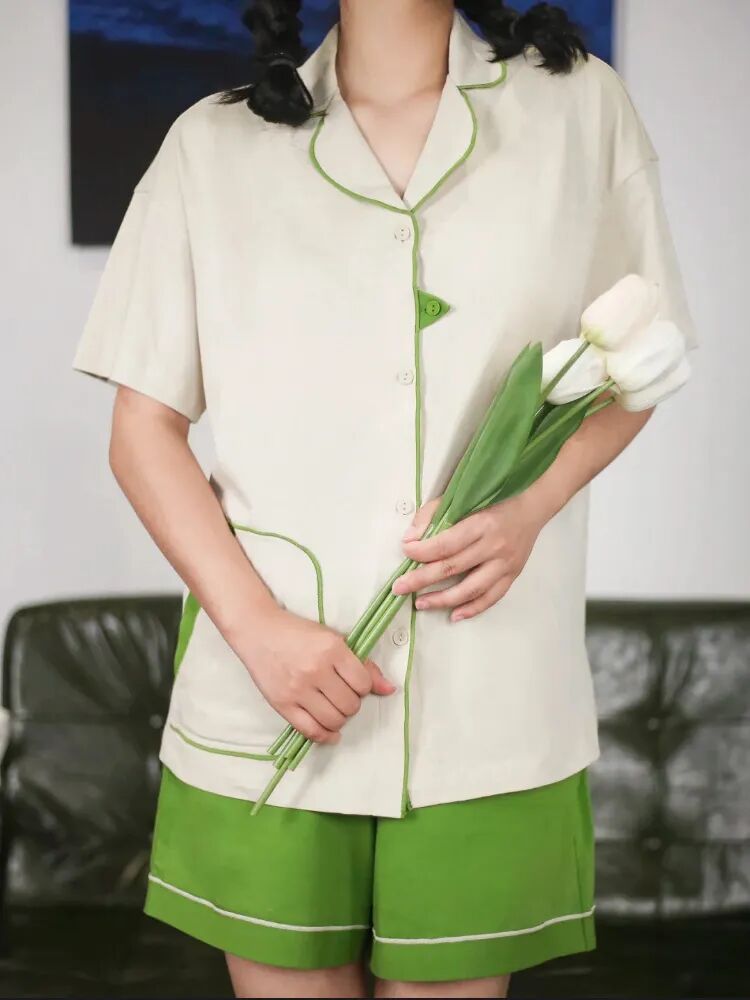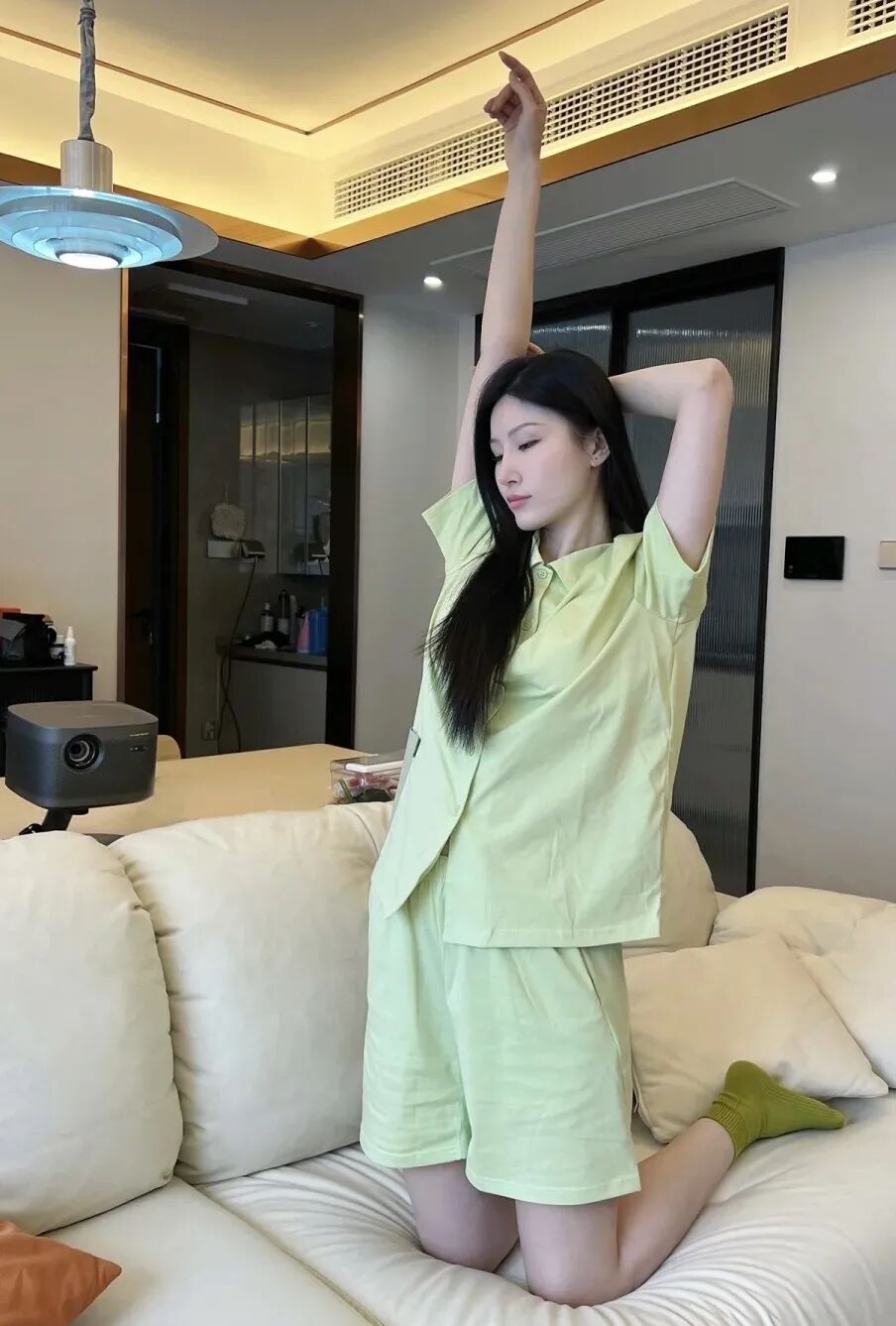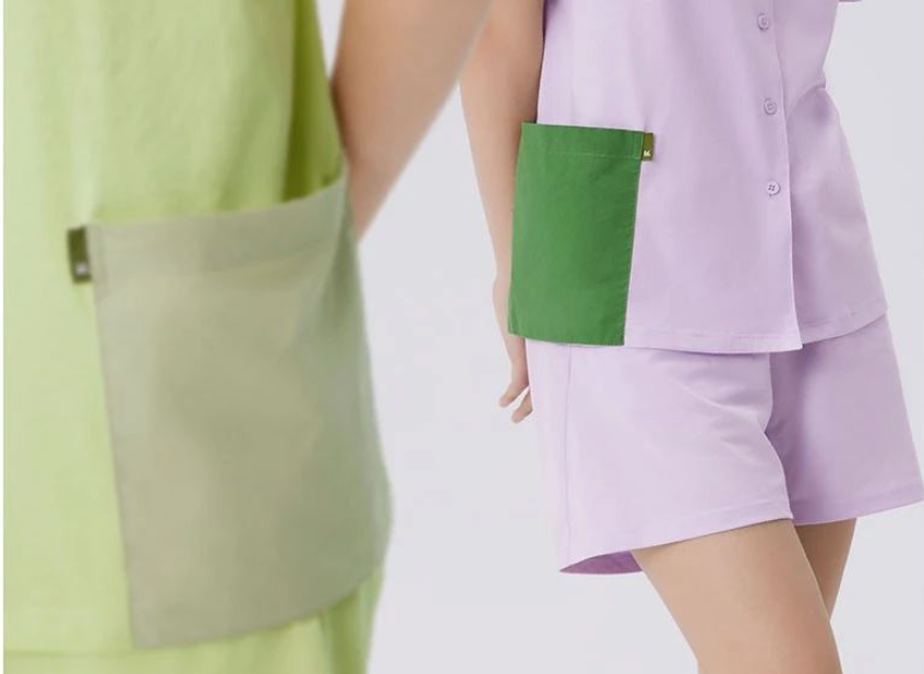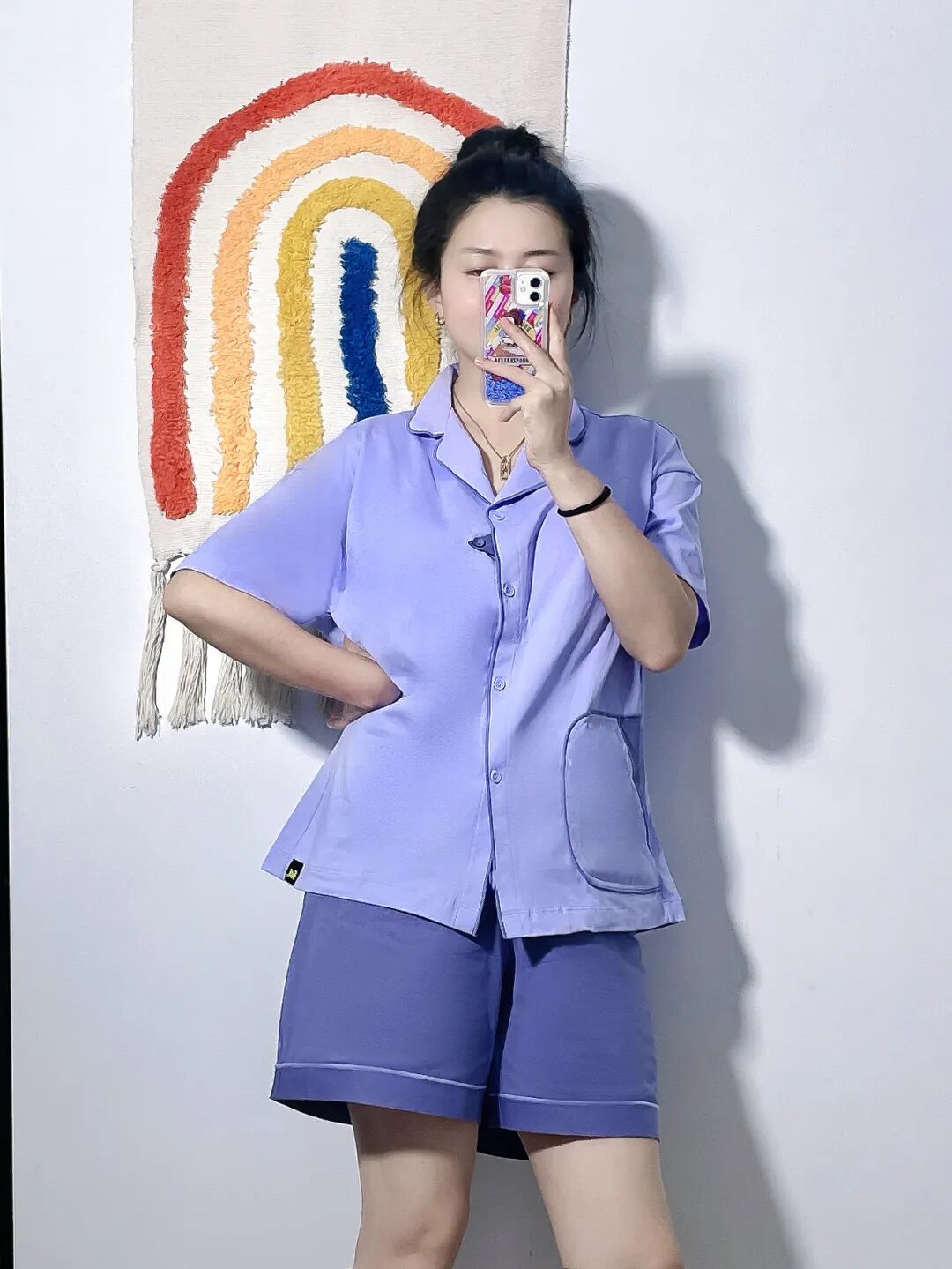 半练家居服的颜值更是戳动人心,宽松设计,舒服又显瘦;配色巨好看,配色清新,外穿也很时尚。 颜值杠杠滴,配色太好看啦! NO.1👉花瓣翻领开衫款 特别喜欢这款的花瓣翻领开衫款,柔美又不失简洁,还能修饰脸型。 自带胸垫免穿内衣,还有防止走光的小纽扣,设计超用心。 领口、衣摆撞色包边设计,比纯色多了几分设计感,又不会过于繁琐。 弹性腰头短裤,方便穿脱,对身材包容性也更大。 还有一个容量很大的口袋,出门倒垃圾遛狗放钥匙手机完全够用! 浅苔绿、鸢尾紫,2个颜色3个尺码,清新减龄。 特惠价到手109元/套