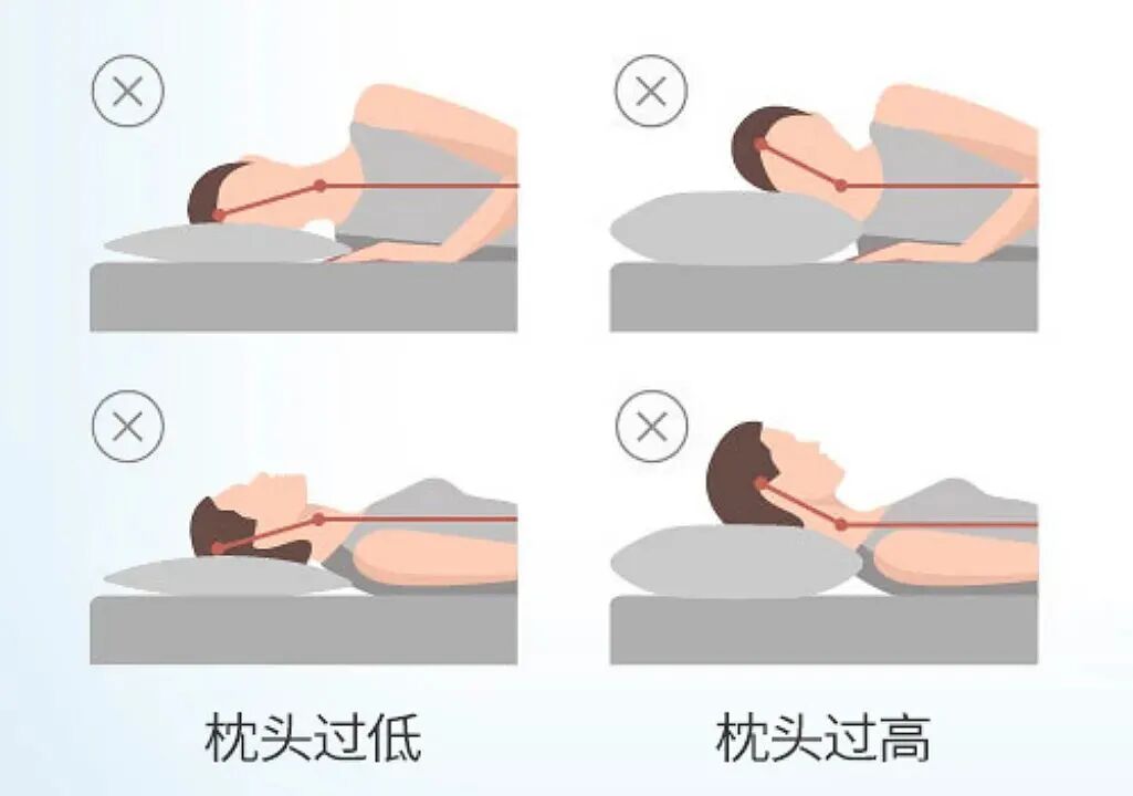 枕头太高、太矮,太硬、太软都不行。往往侧睡舒服,仰睡就高;仰睡舒服,侧睡就矮……
