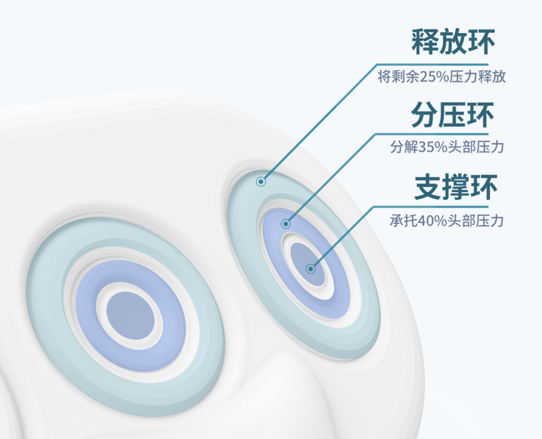 三个同心圆结构,是它舒适睡感的奥秘:中心的圆柱作为支撑,外层两个圆环利用枕芯张力实现科学的线性减压。它还原了大自然中水纹涟漪原理,均匀释放了头部和颈椎的压力,头部压力会往四周分解,不会集中在某一点上对头颈产生压迫感。躺在上面,好像悬浮在水面,从头部到脖子的曲线和枕头完全贴合,连带着脊柱和全身呈放松形态,自然而然就睡着了!翻身的时候,头部能恰好落在它两侧减压环内,耳朵和面部压力也减小了很多。