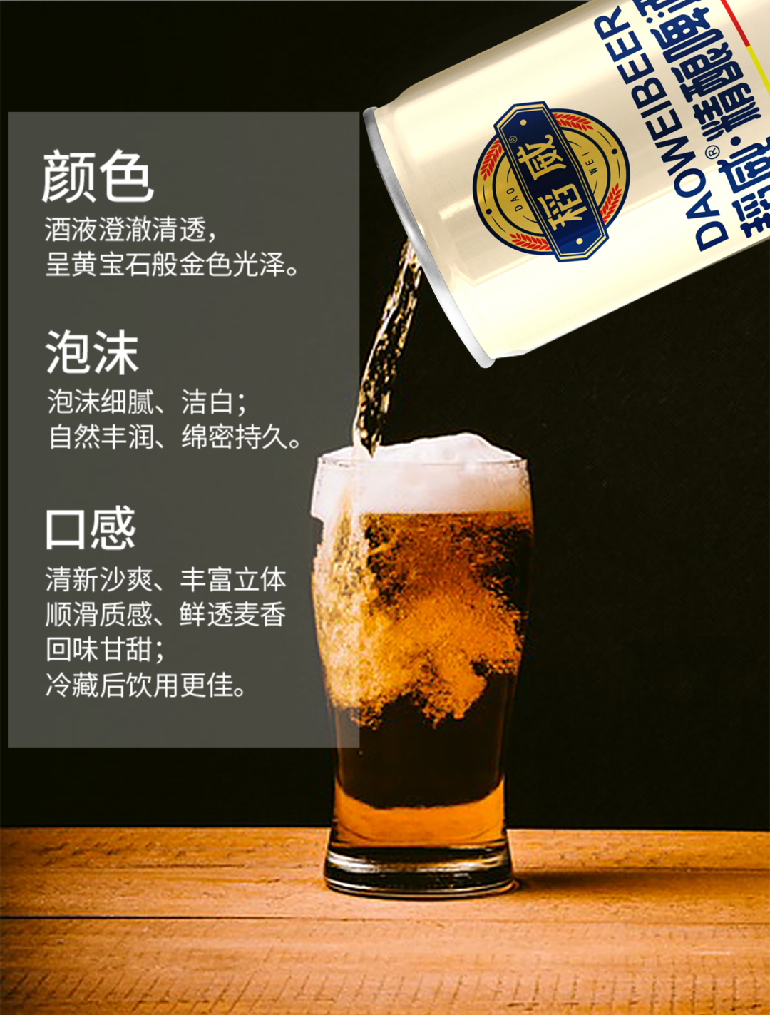 保持了啤酒原始、新鲜的口感,酒体醇厚柔和,泡沫细腻,香醇爽口。