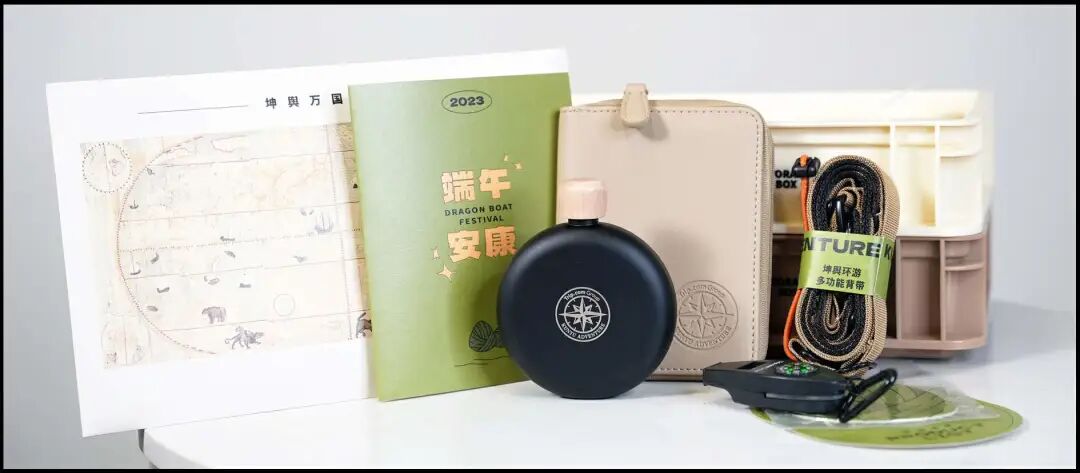 携程这次也走的是露营风,不过设计非常走心。灵感来自明代的世界地图“坤舆万国全图”,双层的收纳箱融入了手绘的坤舆地标、神兽和端午元素。